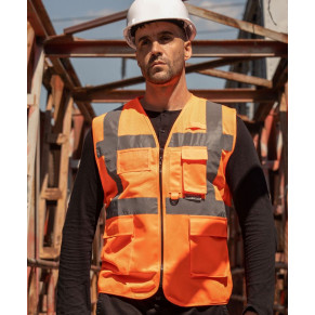 2 vrecká s chlopňami na suchý zips, 1 vrecko na mobilný telefón, priedušné sieťované vsadky, krúžok na pripevnenie karty, kľúčov, atď., certifikované podľa EN ISO 20471 2013 a A1 2016, 1 reflexný pruh cez každé rameno, reflexné pruhy každý 5cm široký okolo hrudníka a tela, dobre viditeľný materiál pod reflexnými pruhmi.