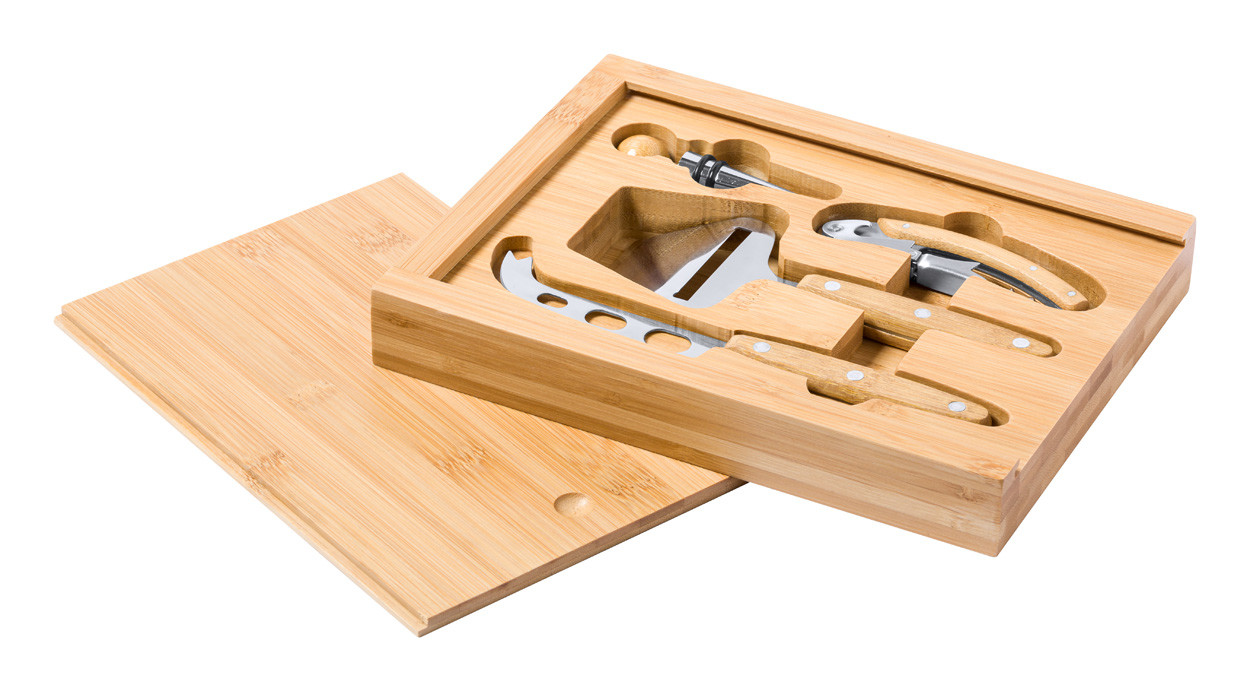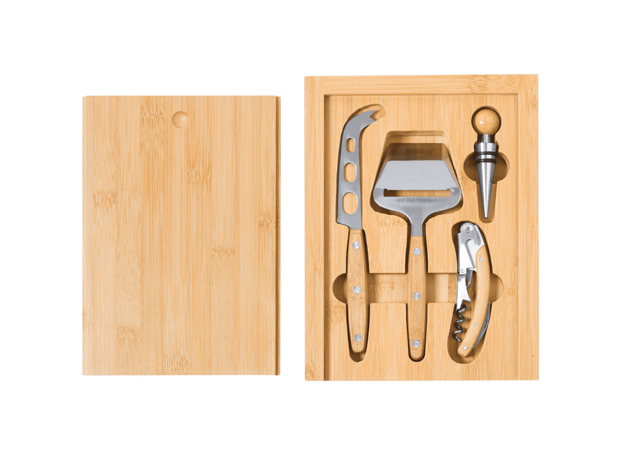 Súprava noža na syr a na víno s bambusovou rukoväťou z nerezovej ocele, v bambusovej krabičke. Vrátane vývrtky, zátky na víno, nože, krájače na syr a dosky.