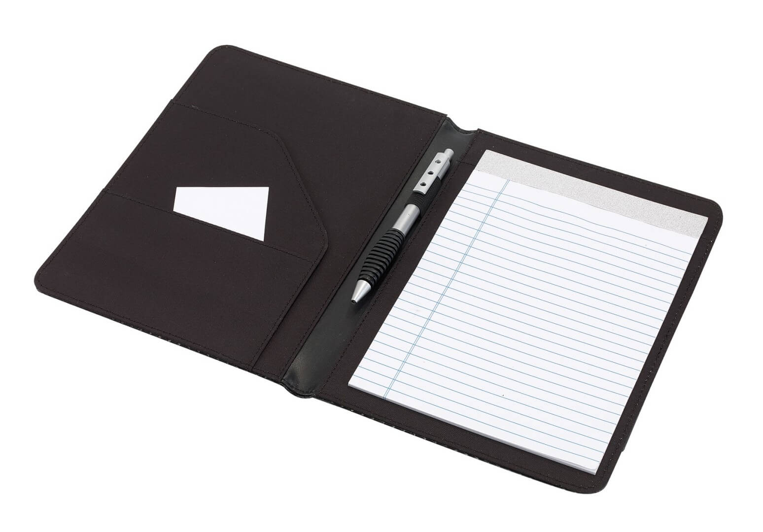 Dosky "Hill Dale", rozmer A5: viaceré zakladacie vrecká, vrátane linajkového poznámkového bloku a pútka na pero, na vonkajšej strane dierovaný dizajn, s kovovým plátkom pre vaše logo