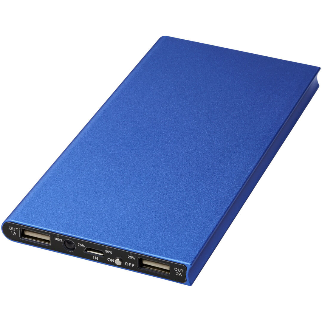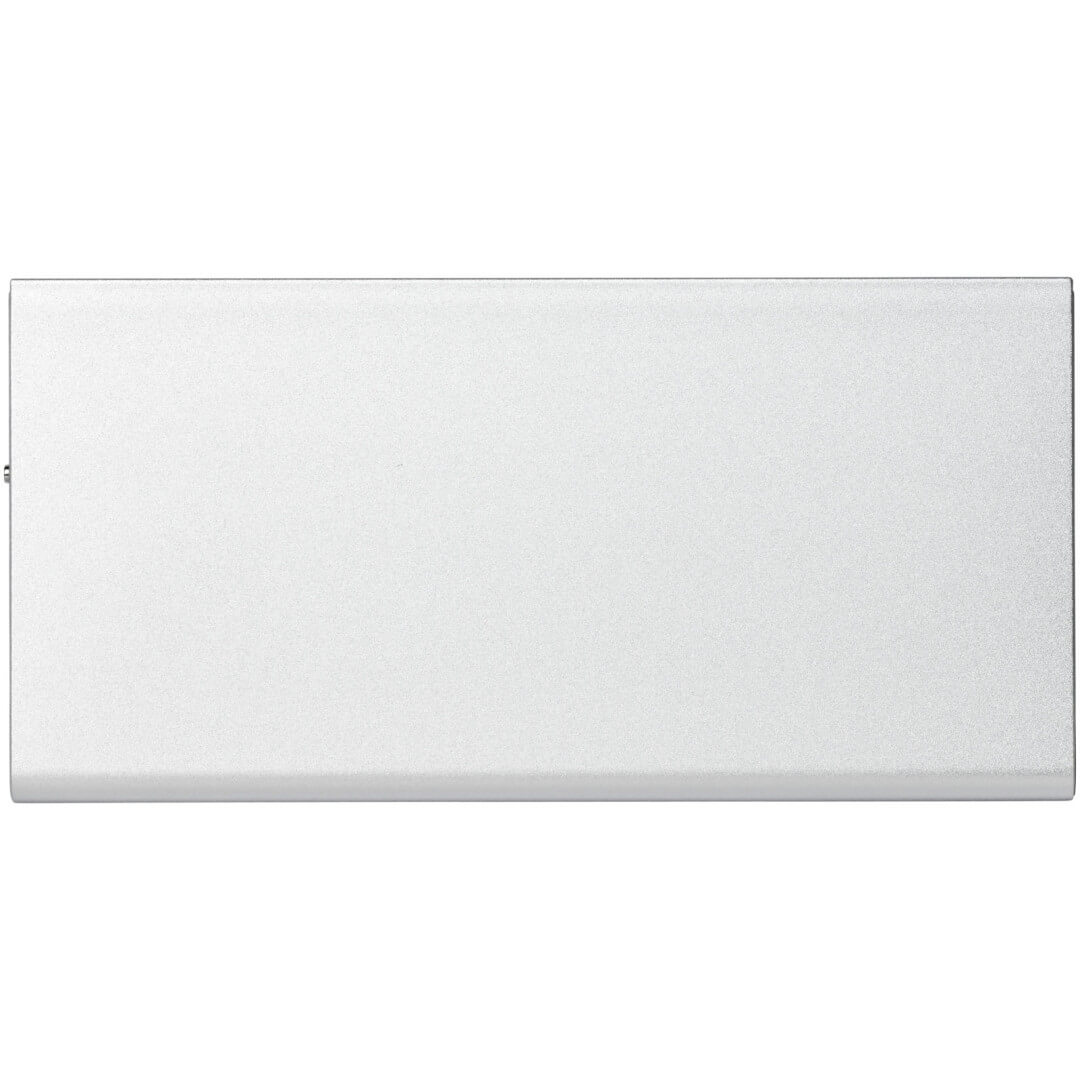 Hliníková PowerBank Plate 8000 mAh. Hliníková PowerBank Plate 8000 mAh má tenkú konštrukciu, ktorý skrýva lítium-polymérový akumulátor triedy A s kapacitou 8000 mAh. LED indikátor sa pri nabíjaní rozsvieti a zobrazuje zostávajúcu kapacitu akumulátora v powerbance. Má vstup a výstup 5 V / 2 A a je vyrobená z odolného hliníka. Sada obsahuje dobíjací kábel USB - Micro USB. Dodáva sa v bielej darčekovej krabičke Avenue. Hliník.