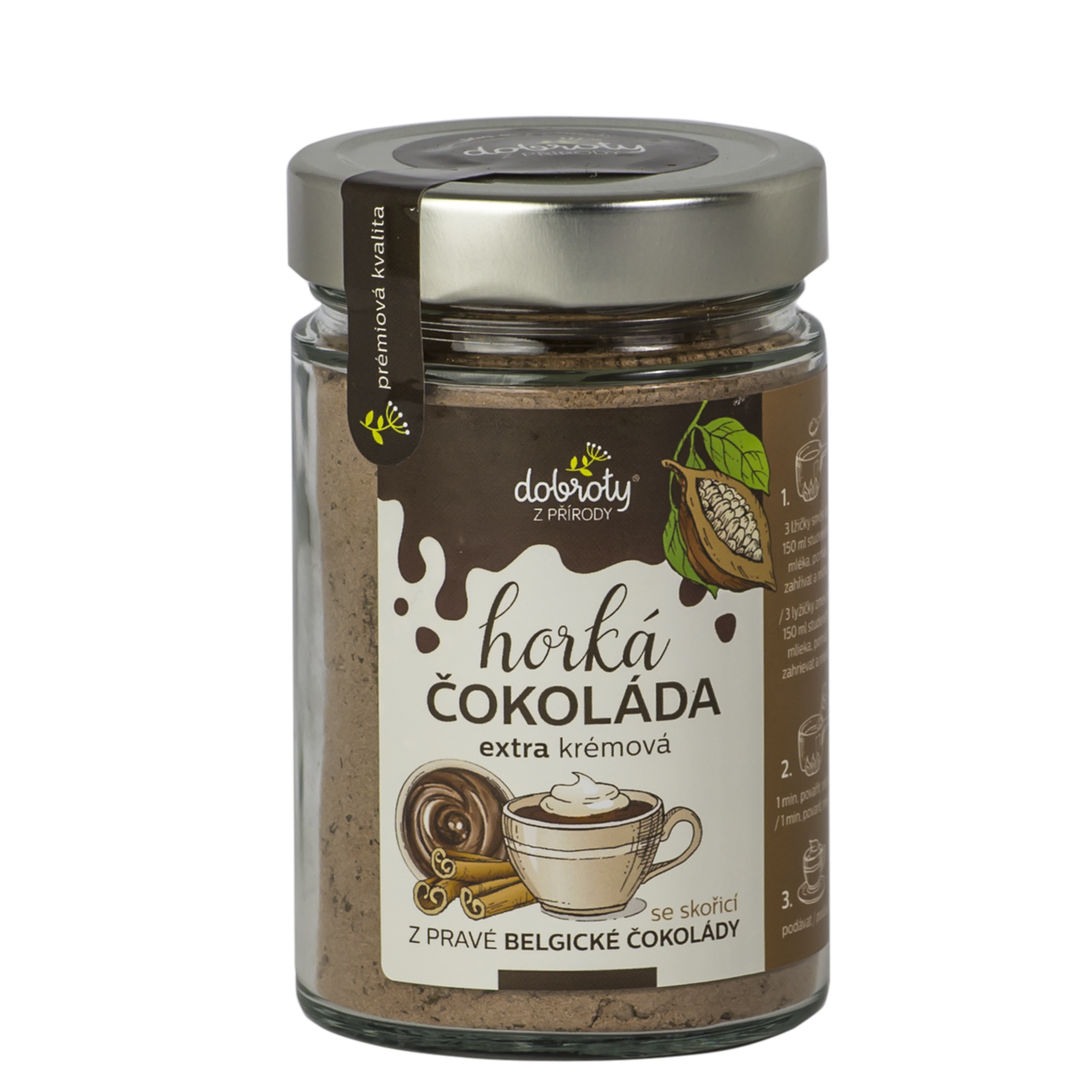 Horúca belgická čokoláda so škoricou je 100 % prírodná rozpustná zmes na prípravu lahodného horúceho nápoja bez konzervantov a zbytočných prísad. Príprava je jednoduchá, podobne ako puding, a výsledok vás zahreje a poteší v každom ročnom období. Zloženie: horká belgická čokoláda (kakaová hmota, cukor, kakaové maslo, emulgátor: sójový lecitín, prírodné arómy) 36 %, trstinový cukor, kukuričný škrob, nealkalizované kakaové prášok 10 %, mletá škorica 3 %. Obsah kakaovej sušiny v čokoláde minimálne 57,8 %, obsah kakaového masla v kakaovom prášku minimálne 20 %.
