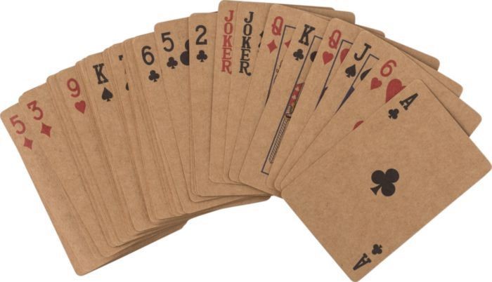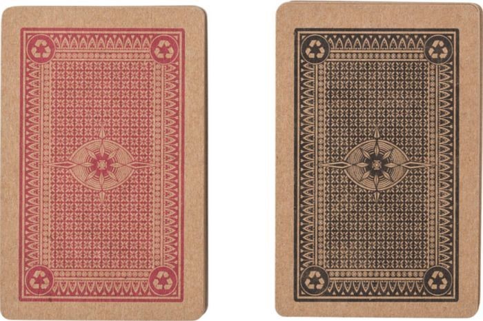 Sada dvoch balíčkov kariet z recyklovaného kartónu. Každý balíček obsahuje 54 kariet (52 kariet + 2 žolíkové karty). Balené po balíčku v kraftovej papierovej krabičke a celé v pevnej kraftovej papierovej krabici. Rozmery: 9,8 x 13,5 x 2,5 cm