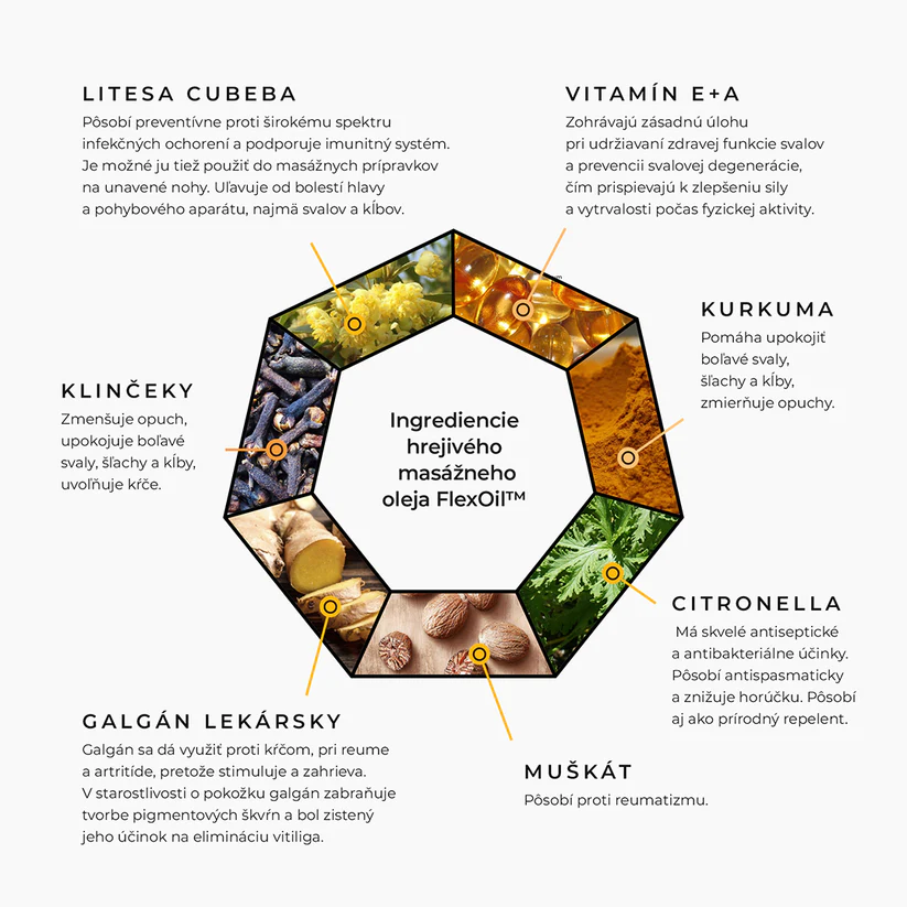 Hrejivý masážny olej FLEXOIL™ obsahuje prírodné výťažky z litsey cubeby, klinčekov, galgánu, muškátu, kurkumy a citronelly, obohatené o vitamíny E + A. Uvoľňuje svaly, znižuje opuchy, pôsobí proti kŕčom, reumatizmu a podporuje prekrvenie. Vhodný na regeneráciu aj prípravu svalov na záťaž.
