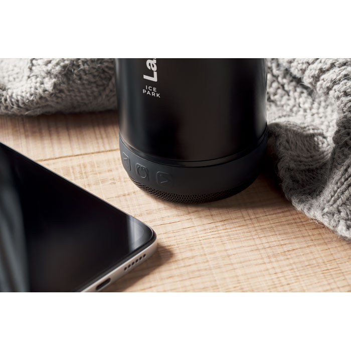 Dvojstenná vákuová izolovaná fľaša z recyklovanej nerezovej ocele (90 % recyklovanej nerezovej ocele a 10 % nerezovej ocele). Silikónové pútko a odnímateľný 3W bezdrôtový reproduktor. Objem: 500 ml. Batéria s kapacitou 500 mAh. Pre čistenie je možné reproduktor vybrať.
