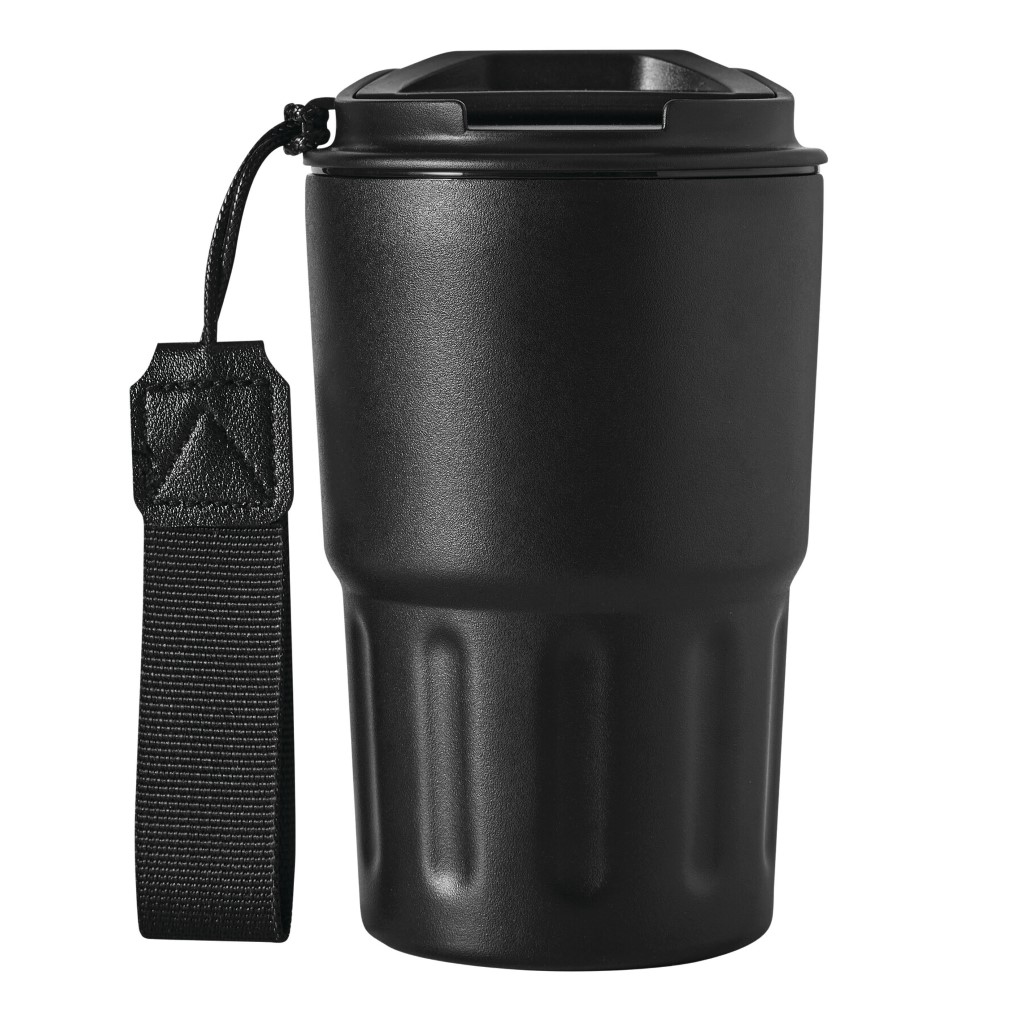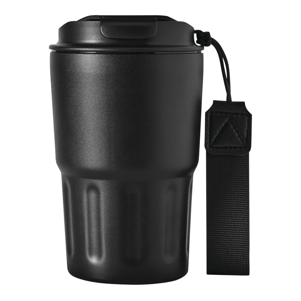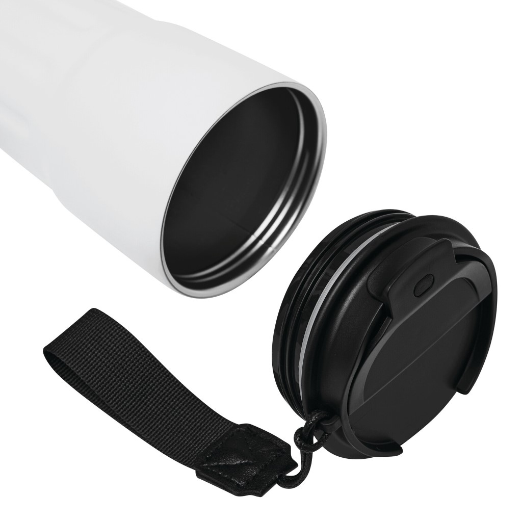 Izolovaný hrnček TRAVEL MUG, dvojstenný: vnútorná aj vonkajšia strana z nehrdzavejúcej ocele, matný práškový nástrek, plastové viečko s bezpečným skrutkovacím uzáverom, silikónové tesnenie a integrovaný otvor na pitie, objem cca 400 ml, remienok na zápästie z recyklovaného plastu.