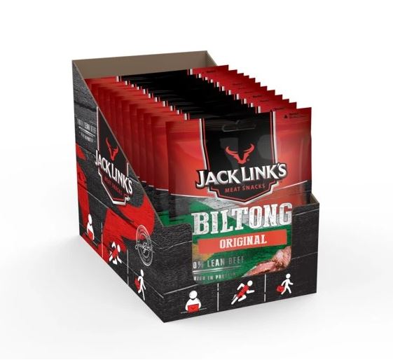 Jack Link’s Biltong Original – chudé hovädzie mäso marinované podľa rodinného receptu, následne pomaly sušené na vzduchu a krájané na hrubšie plátky tradičným juhoafrickým spôsobom. Vysoký obsah bielkovín, nízky obsah cukru, jemne korenistá chuť. Biltong je šťavnatejší ako klasické jerky a ponúka autentický zážitok pre všetkých milovníkov mäsa.