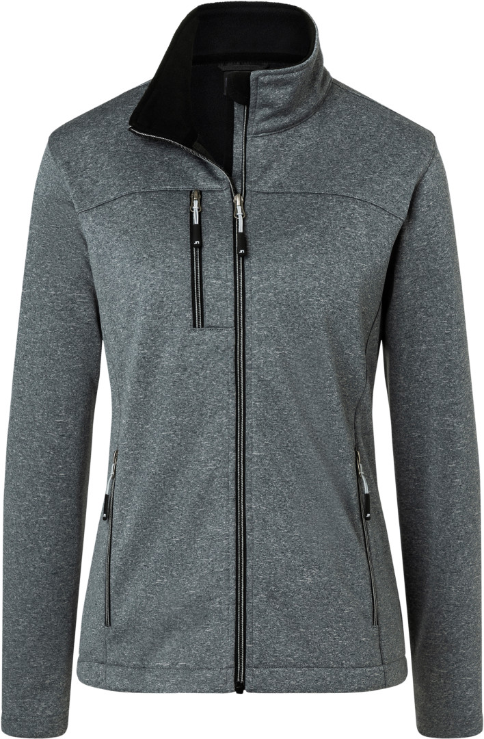 280g / m², 100% polyester 2 vrstvový softshell materiál, Dotyk podobný hladkému fleece materiálu, stojacie golier, prepínanie na podložený zips s chráničom brady, 2 bočné vrecká a 1 náprsné vrecko na zips, vnútri fleece v kontrastnej farbe, ľahko vypasovaný strih
