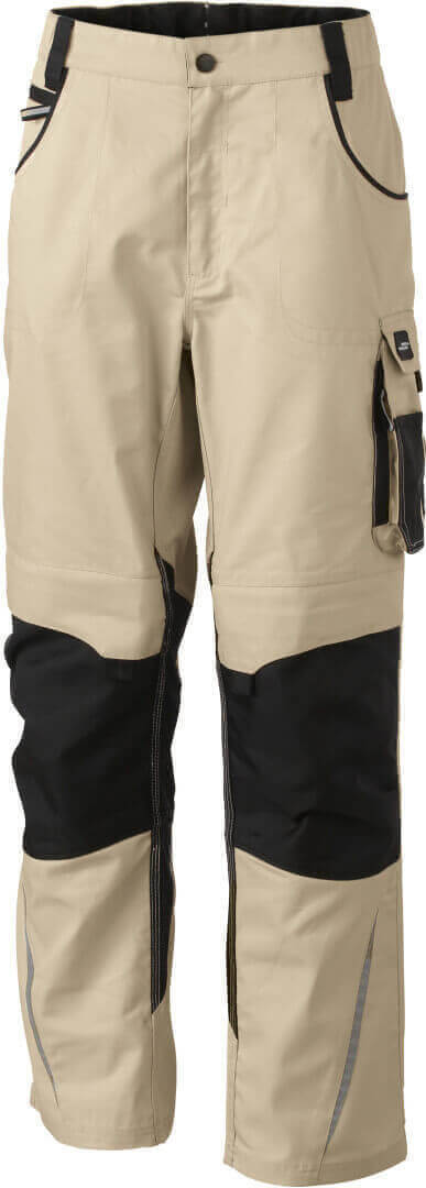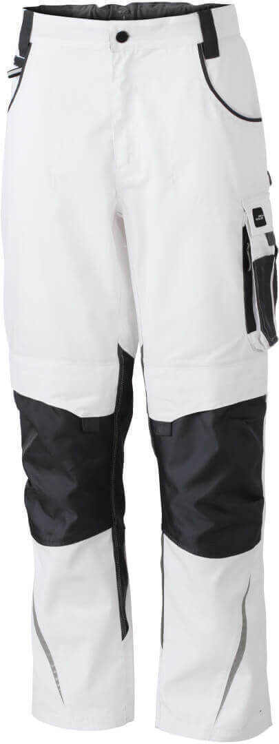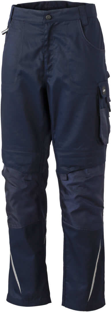 260g / m², 65% polyester, 35% bavlna, podsádka: 100% polyamid, Cordura® Robustný látka, elastický pásik s pútkami na pásku, 2 vrecká so zipsom, s vreckom na kolenách na polstrovanie zosilnenú materiálom Cordura®, rôzne prestrihnuté vrecká a vrecká na náradie, reflexné prvky vpredu a vzadu, vhodný vankúš na kolená výr. č. JN823