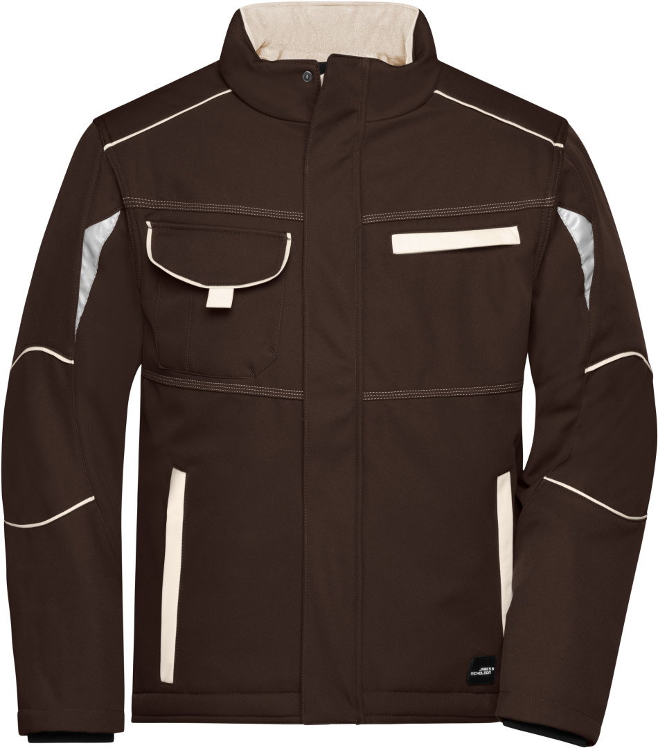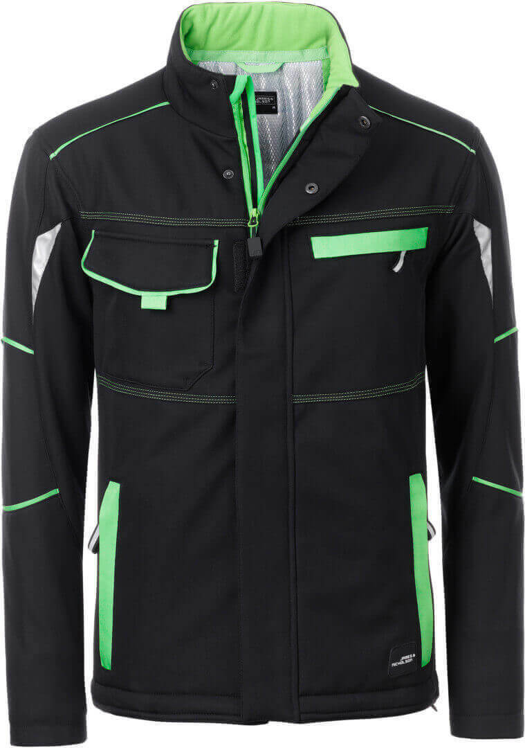 vetru a vode odolná (2.000mm vodného stĺpca), priedušná a priepustná pre vodné pary (2.000g / m² za 24h), odolný a robustný softshell, stojačik s jemnýn fleecom vnútri, po celej dĺžke skrytý zips s ochranou brady a chlopňou proti vetru, predĺžený chrbát, bočné vrecká na zips, náprsné vrecko, vnútorné vrecko, vrecko na mobil vo vnútri, reflexné prvky na rukávoch a na zadnej strane, zips pre ľahký potlač a výšivku, zakryté zipsy a gombíky