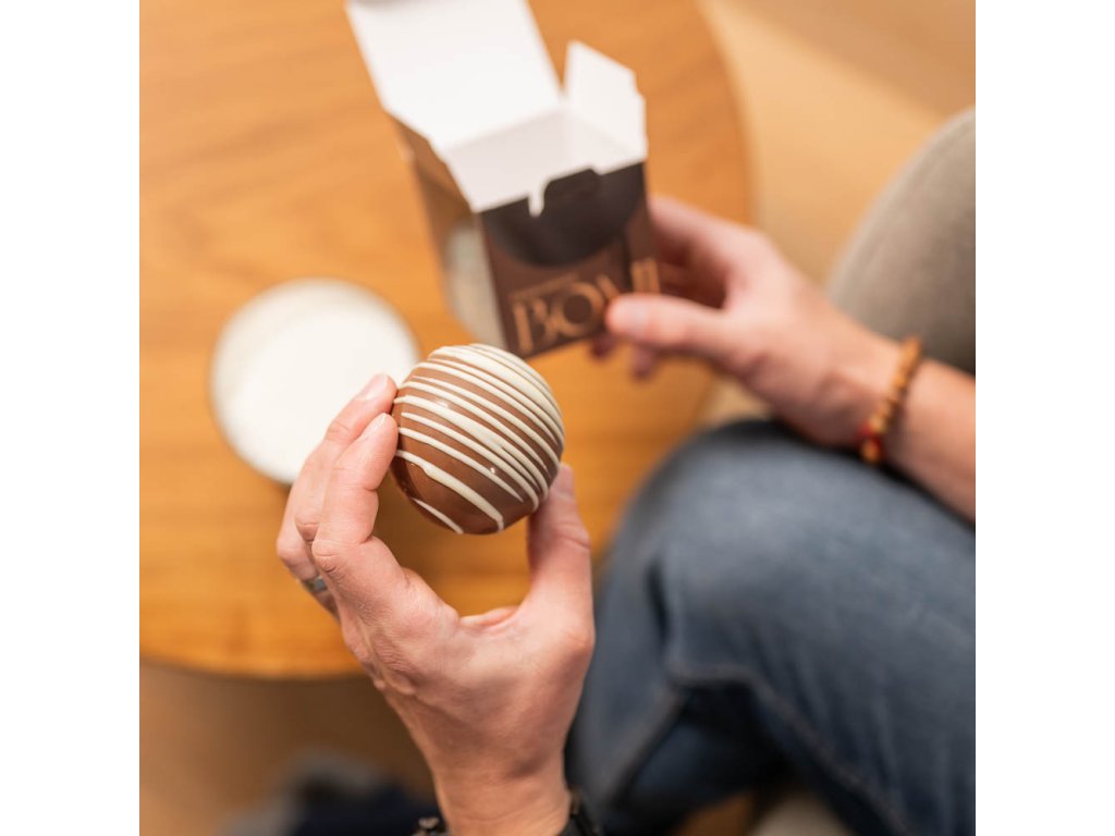 Čokoládová bomba s marshmallow – sladké prekvapenie do horúceho nápoja Objavte dokonalú harmóniu čokoládového zážitku s našou čokoládovou bombou. Tento lahodný guľatý zázrak je vyrobený z prvotriednej mliečnej čokolády s jemnými akcentmi bielej čokolády, ktoré jej dodávajú luxusný vzhľad aj chuť. Vo vnútri sa ukrývajú malé, mäkučké kúsky marshmallow, ktoré sa po zaliatí horúcim mliekom rozplývajú a dodajú nápoju jemnú sladkosť aj nadýchanú štruktúru. Perfektný darček, malá pozornosť alebo zimný pôžitok pre seba. Zloženie: kakaová hmota, kakaové maslo, sušené mlieko, cukor, emulgátor (sójový lecitín), prírodná vanilka; marshmallow (glukózo-fruktózový sirup, cukor, voda, kukuričný škrob, želatína, farbivo E162, aróma) Hmotnosť: 45 g. Minimálna trvanlivosť: 12 mesiacov