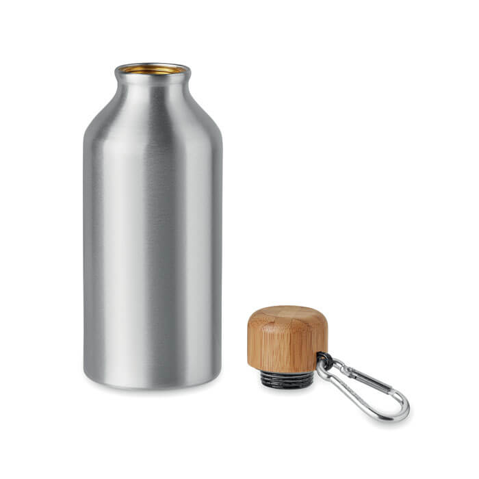Jednostenná hliníková fľaša s bambusovým viečkom a karabínou (karabina nie je určená prelezectvu, jedná sa o reklamný produkt). Objem: 800 ml