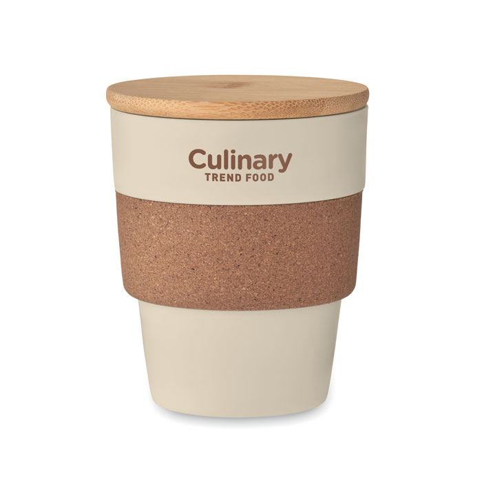 Jednostenný pohárik GALAO z recyklovaného PP s korkovým ochranným prstencom a bambusovým viečkom. Objem: 300 ml. Keďže sa jedná o jednostenný hrnček, môže tu dochádzať k prenosu tepla. Bambus je prírodný materiál, môže dôjsť k miernym zmenám farby, dekorácie a veľkosti. Netečie.