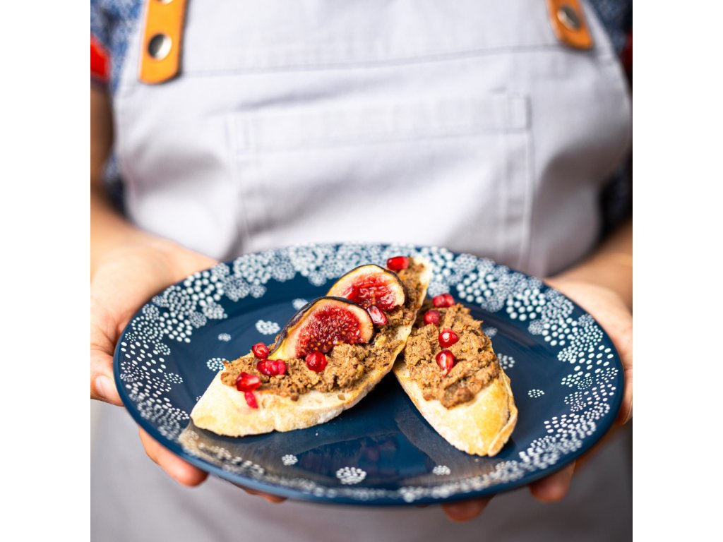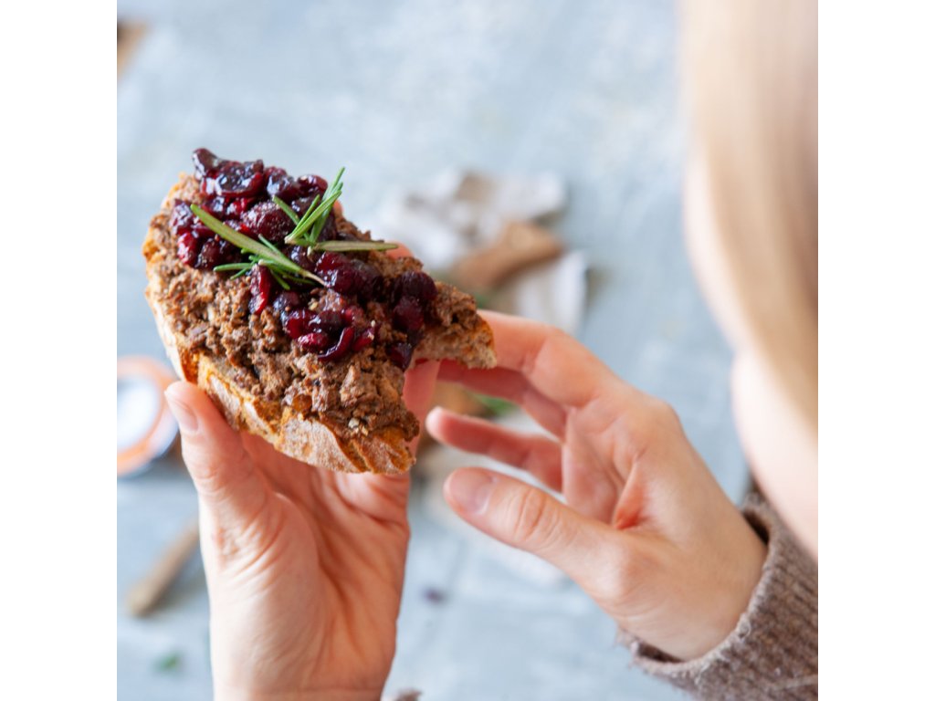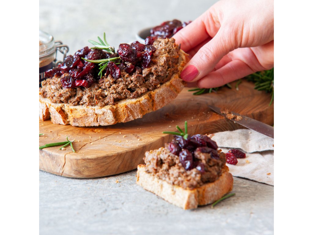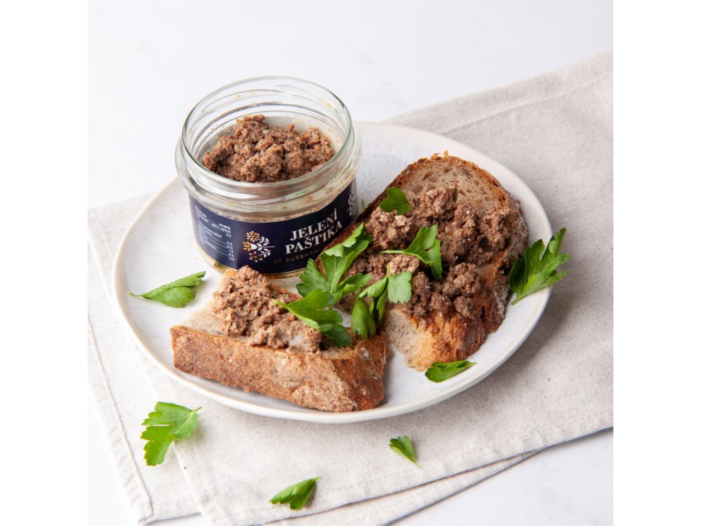 Jelenia paštéta so sušenými slivkami je gurmánsky zážitok pre milovníkov zveriny. Kombinuje šťavnaté jelenie mäso a slivky macerované v červenom víne, ktoré dodávajú paštéte jemnú sladkastú a ovocnú chuť. Výborne vynikne na chrumkavom chlebe či v kombinácii s vyzretými syrmi. Zloženie: jelenie mäso (min. 55 %), kuracie pečienky (13 %), bravčová masť (13 %), sušené slivky (5 %), červené víno, cesnak, soľ, čierne korenie. Bez lepku a konzervantov. Váha: 170 g