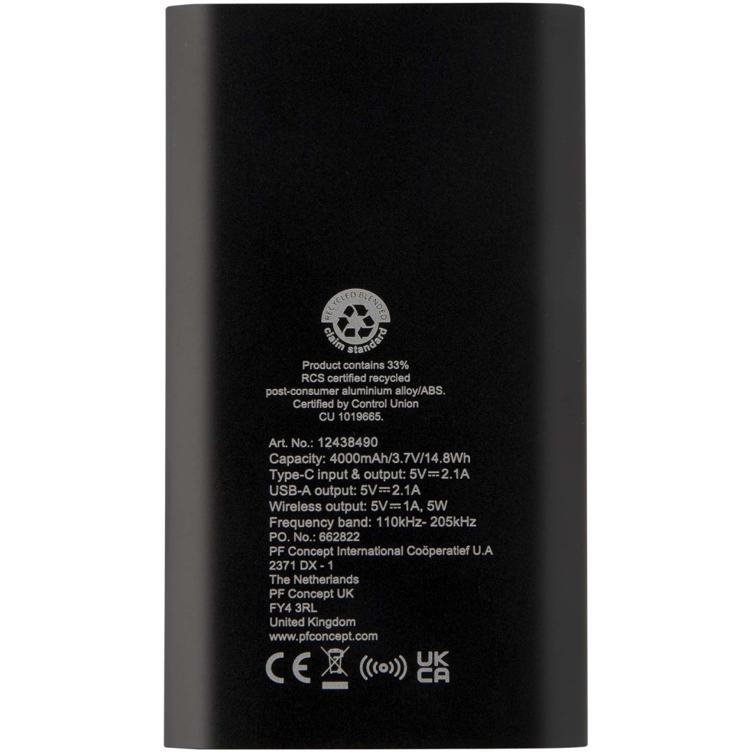 Powerbanka so vstupným/výstupným portom typu C a portom USB typu A, čo znamená, že je možné nabíjať 2 zariadenia súčasne. Podporuje tiež 5W bezdrôtové nabíjanie pre všetky zariadenia s podporou Qi. Powerbanka je vybavená 4000mAh lítium-polymérovou batériou, ktorá poskytuje maximálny celkový výstupný výkon 10 W. Táto powerbanka je vyrobená z 28% z recyklovaného plastu s certifikáciou RCS. Dodávané s nabíjacím káblom TPE typu C na USB typu A.