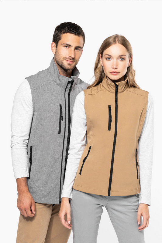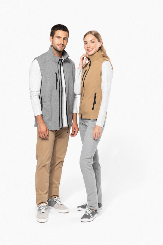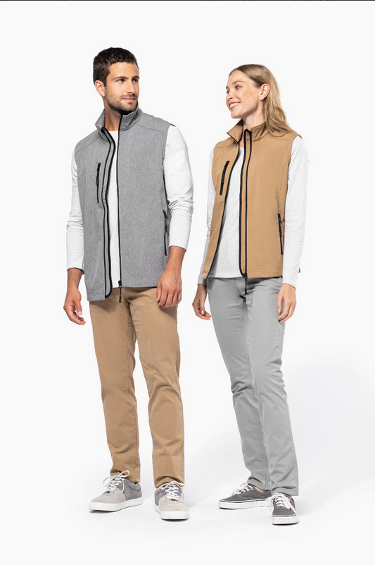 Trojvrstvová, priedušná, vetru a vode odolná softshellová vesta na telo s náprsnými a bočnými vreckami na zips. S priedušnou strednou vrstvou a vnútornou vrstvou z micro polar fleecu. Materiál: 95 % polyester a 5 % elastan, 300 g/m². Výrobok značky Kariban. New