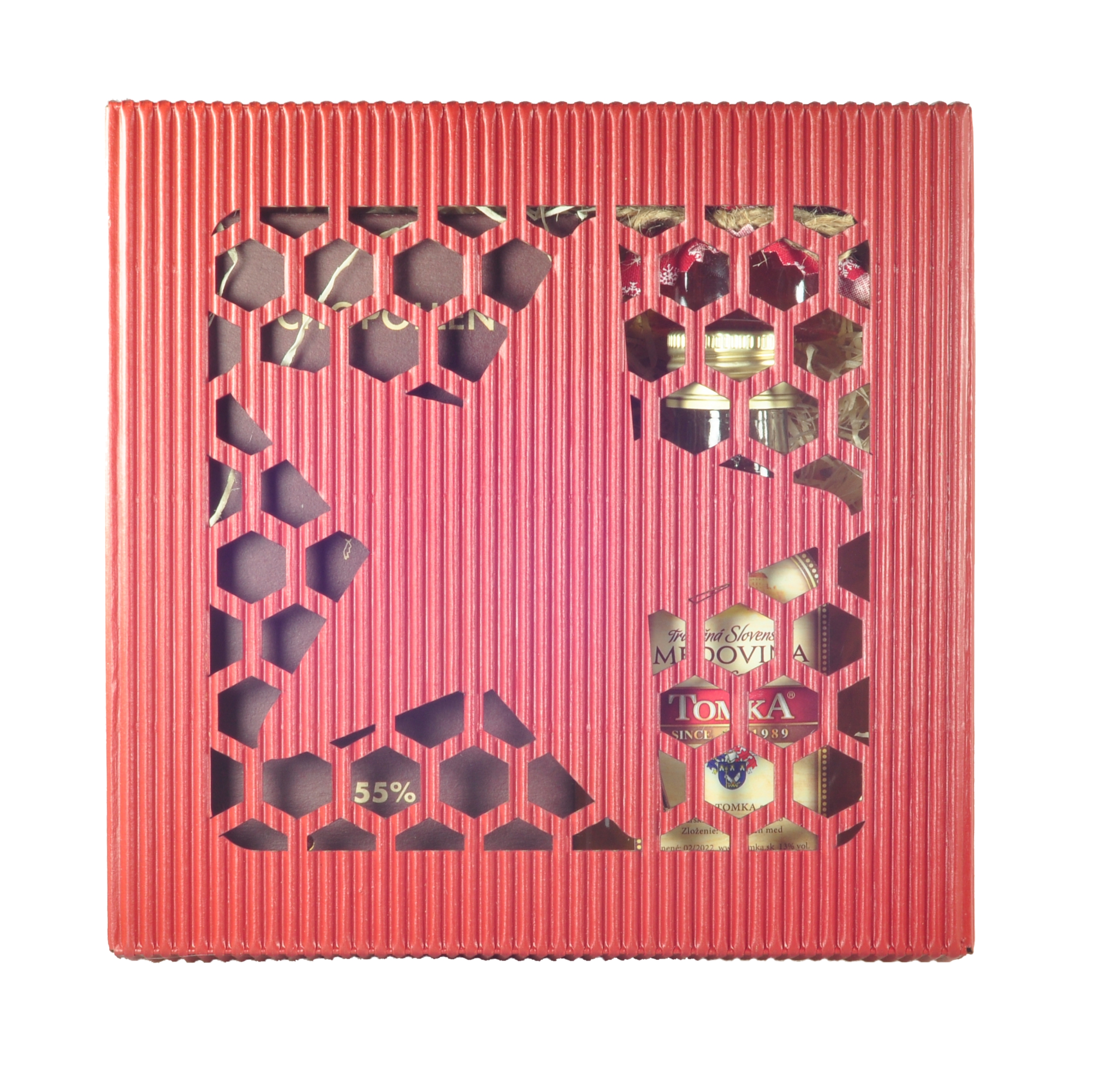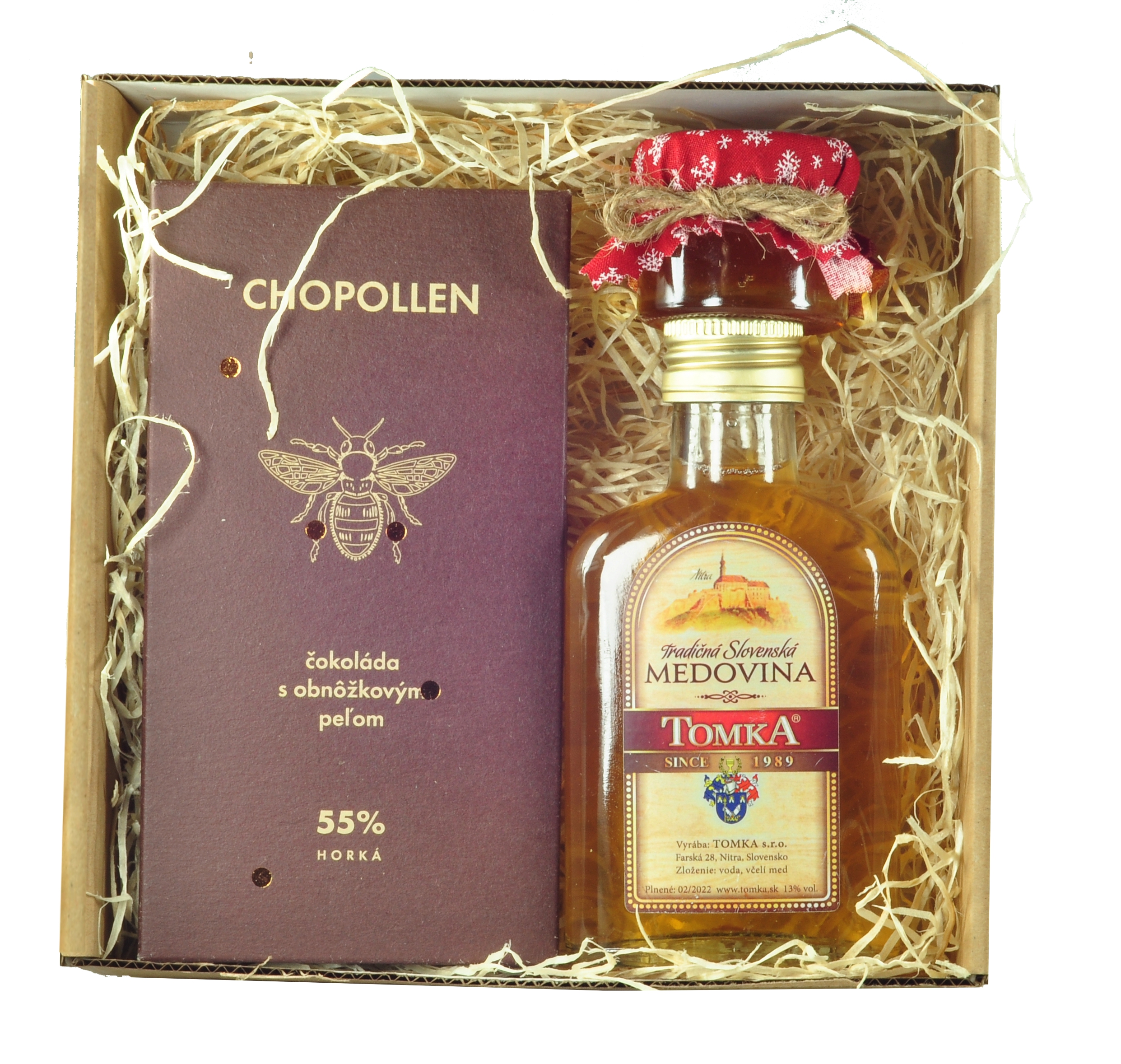 Kazeta obsahuje: tradičná medovina slovenského výrobcu TOMKA, zrejúca v dubových sudoch 0,1l, čokoláda s včelím peľom 75g, med od včelára 40g v pohári s textilnou dekoráciou - farba podľa výberu zákazníka. Kazeta je z papierovej lepenky KRAFT s okienkom s voštinovým motívom podlepeným transparentnou fóliou a vystlaná drevenou vlnou. Komplimentka papierová vložená v kazete. Všetky produkty pôvodom zo Slovenska. Rozmer: 185x185x50mm. Váha: 240g