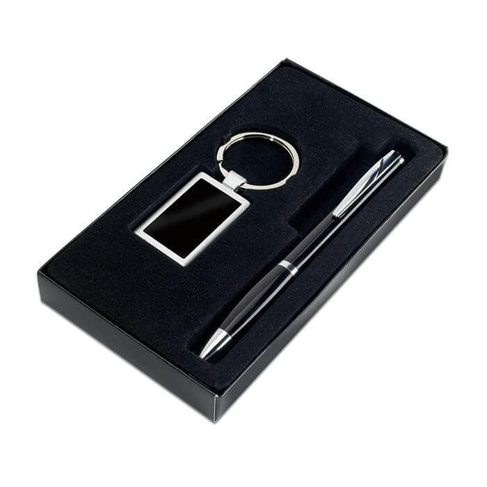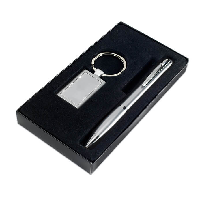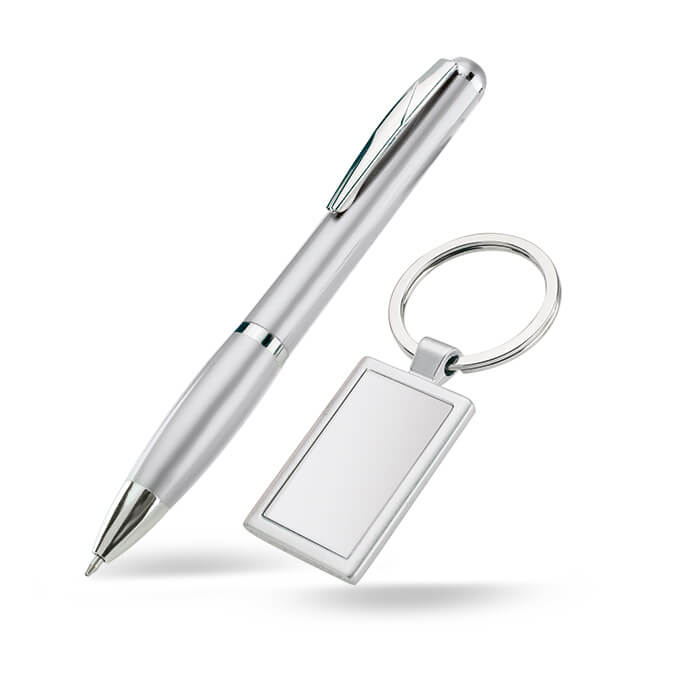 Najatraktívnejšia darčeková sada v papierovej krabičke zložená z plastového guličkového pera a hliníkovej kľúčenky s farebne zladenou doštičkou pre umiestenie loga. Modrý atrament.