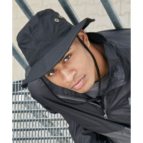 Široká, plochá krempa, patentky na bočnej strane pre pripevnenie ku krempe, 8 ozdobných švov na krempe, páska so zarážkou, po stranách 4 kovové očká, nesmie sa prať, nemožno žehliť, nemožno sušiť v sušičke, nemožno chemicky čistiť.