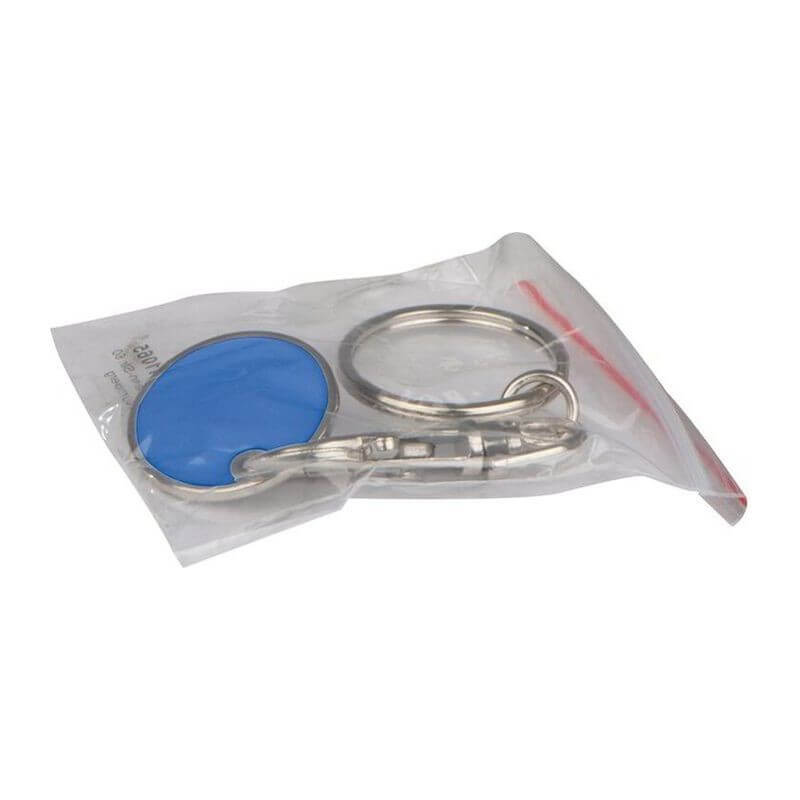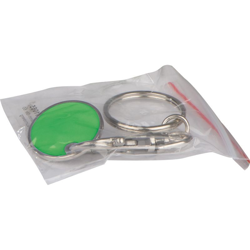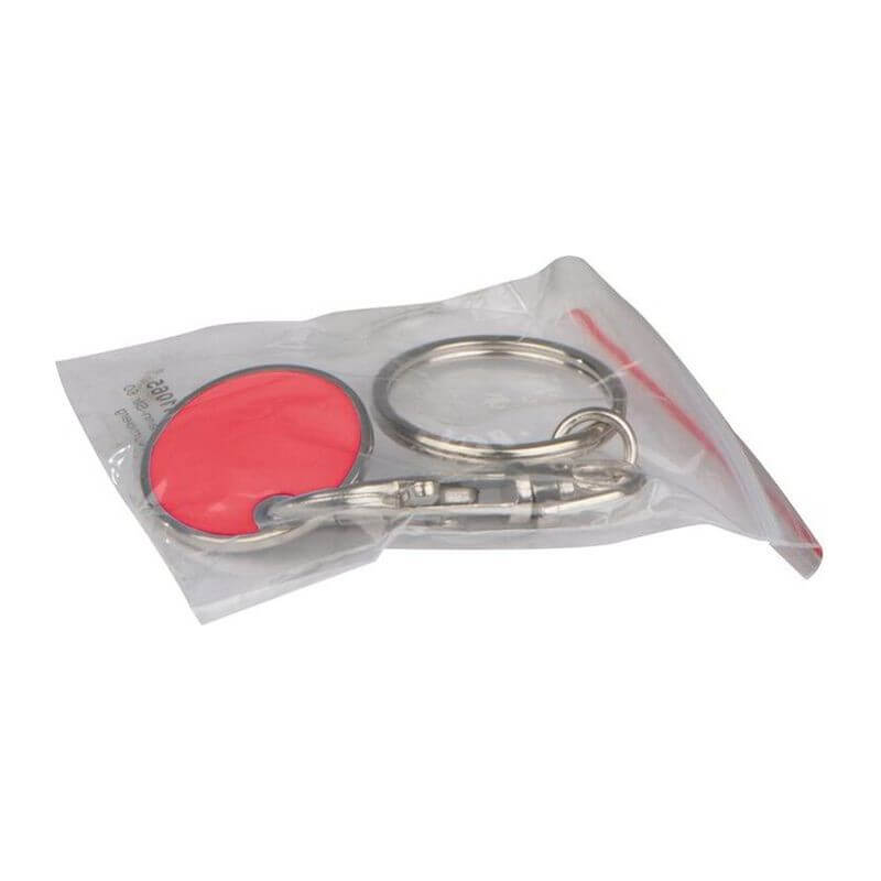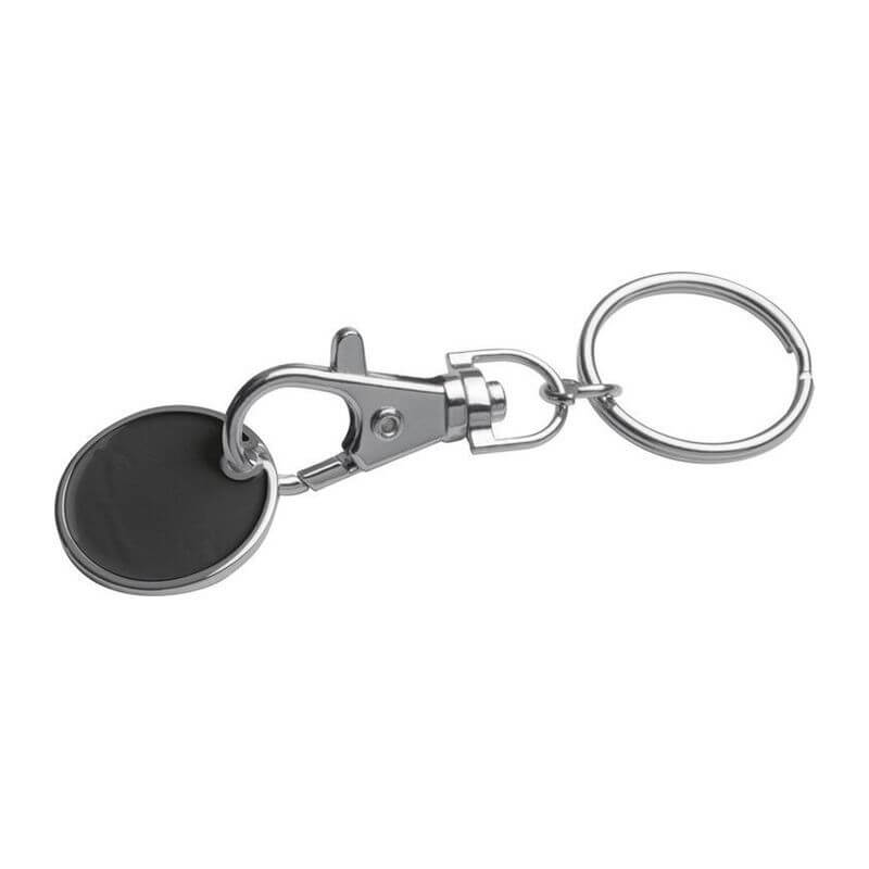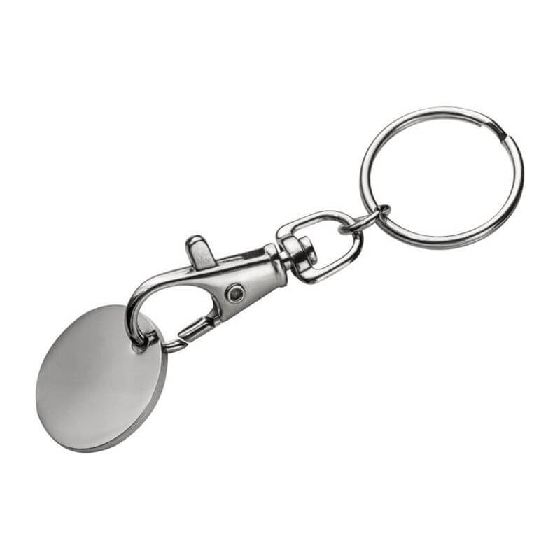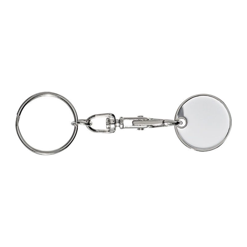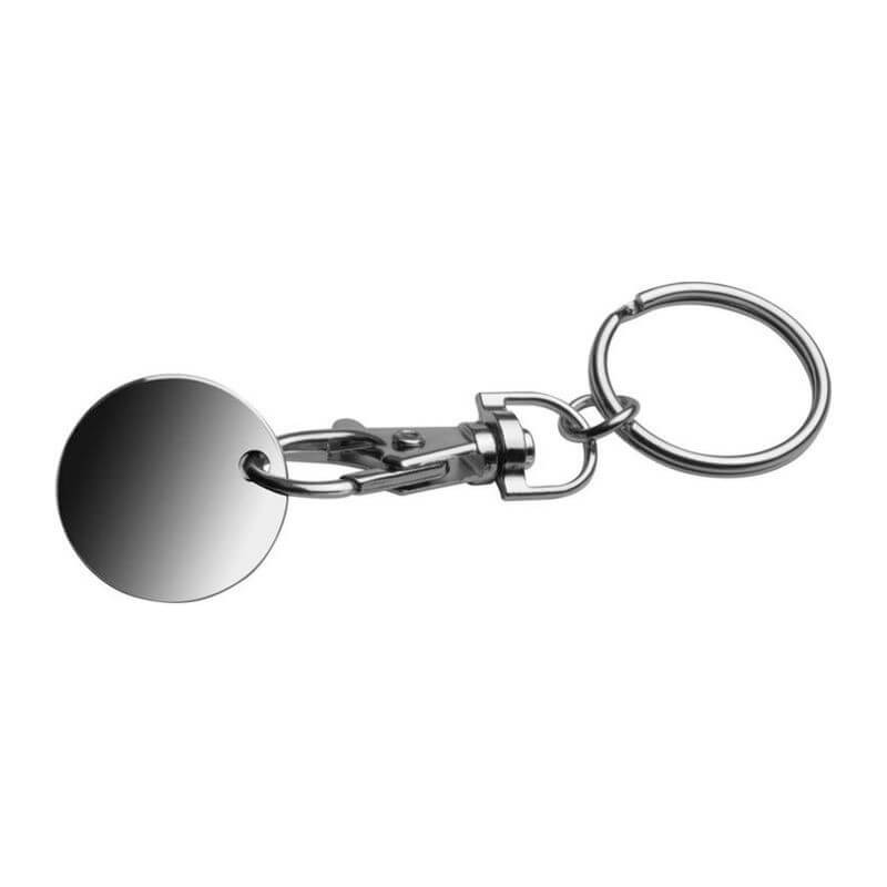 Kľúčenka s karabínkou a s odnímateľným žetónom na nákupné vozíky. Mince majú na jednej strane bielu farbu, čo znamená ideálne miesto pre Vaše logo. Ako potlač odporúčame gravírovanie.