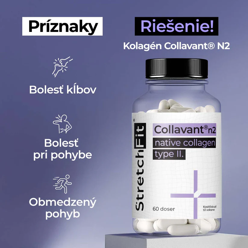 Nativný kolagén typu II Collavant® N2 pomáha pri udržiavaní flexibility a zdravia kĺbov, najmä pri dlhodobom alebo opakovanom zaťažení. Je ideálny pre športovcov, seniorov aj osoby so zvýšenou fyzickou aktivitou. Už jedna kapsula denne pokrýva odporúčanú dennú dávku. Zloženie: vláknina zo živice konárov Akácie senegalskej (Acacia Senegal), vitamín C (Kyselina L-Askorbová); kapsula: hydroxypropylmetylcelulóza, natívny nedenaturovaný Kolagén Typ II, protihrudkujúca látka: stearan horečnatý.