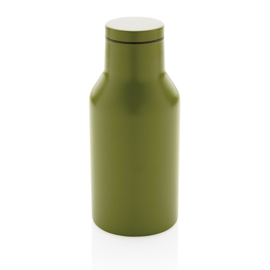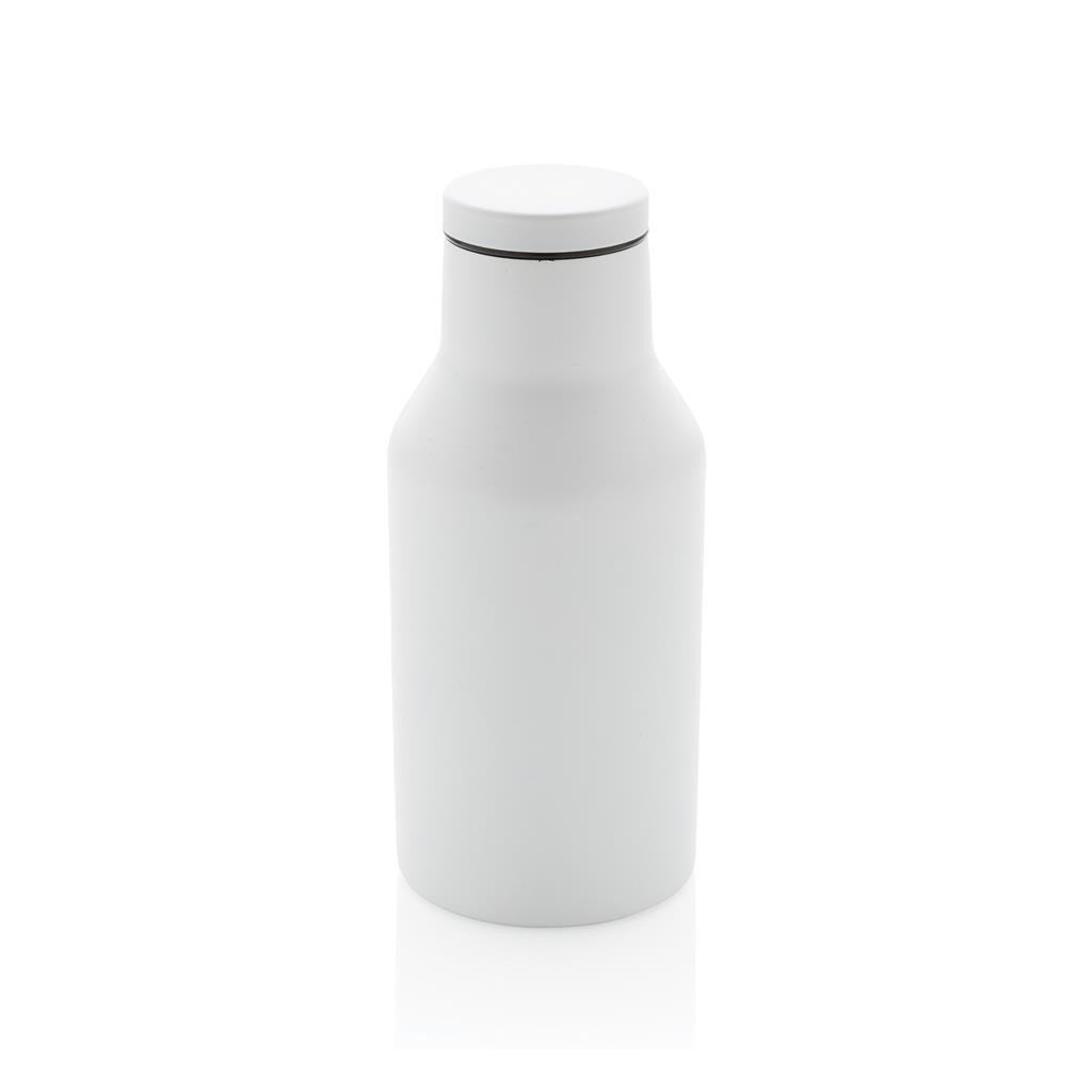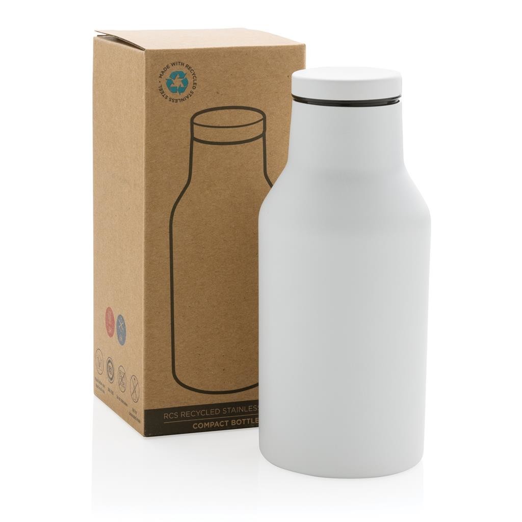 Kompaktná nepriepustná termo fľaša s bezpečným skrutkovacím uzáverom so širokým hrdlom pre ľahké čistenie a plnenie. Dvojstenná vákuová izolácia uchová nápoj horúci po dobu až 3h a studený až 6h. Vyrobené z RCS recyklovanej nehrdzavejúcej ocele. RCS (Recycled Claim Standard) je globálny štandard, ktorý umožňuje overiť použitie recyklovaného materiálu v produkte naprieč celým dodávateľským reťazcom. Podiel použitého recyklovaného materiálu vzhľadom na celkovú váhu produktu: 89 %. Bez BPA. Objem: 300 ml. Balené v FSC kraftovej krabičke.
