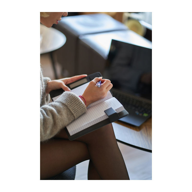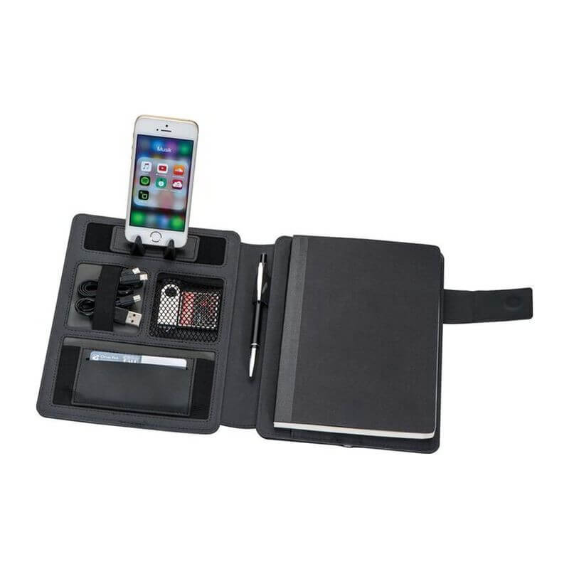 Poznámkový blok vo formáte A5 so zabudovanou Power Bankou s kapacitou 4000mAh. Zápisník má 128 strán a v prednej časti úložný priestor. Ako potlač odporúčame sieťotlač.