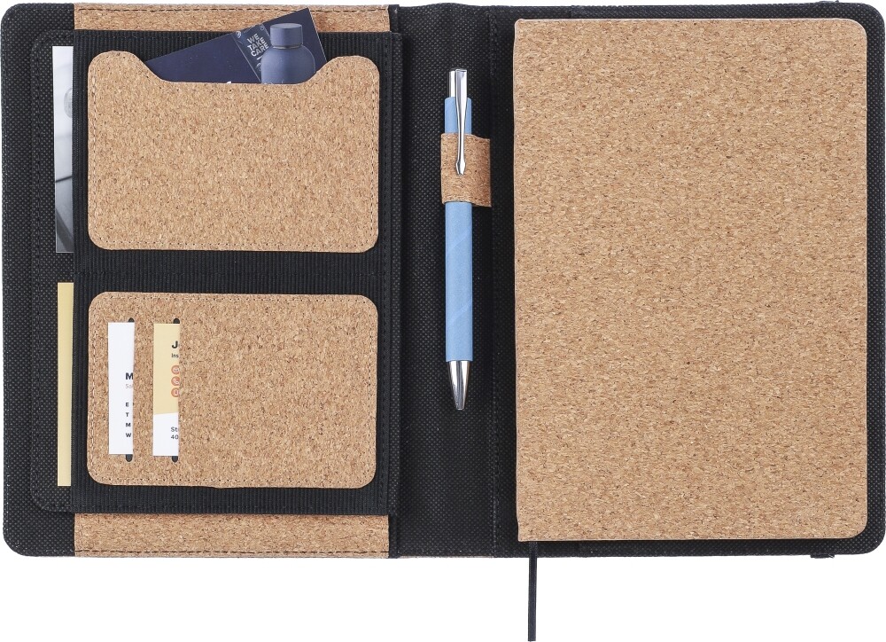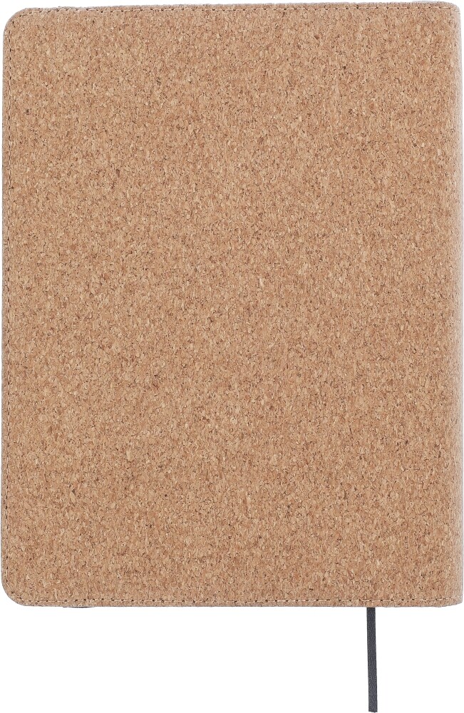 Korkové portfólio, veľkosť cca A5. Má vnútorné vrecká, elastický pásik, pútko na pero a odnímateľný zošit formátu A5 so 192 linkovanými listami recyklovaného papiera (70 g/m2). Balené v hodvábnom papieri. Rozmery: 21 x 28 x 4,2 cm