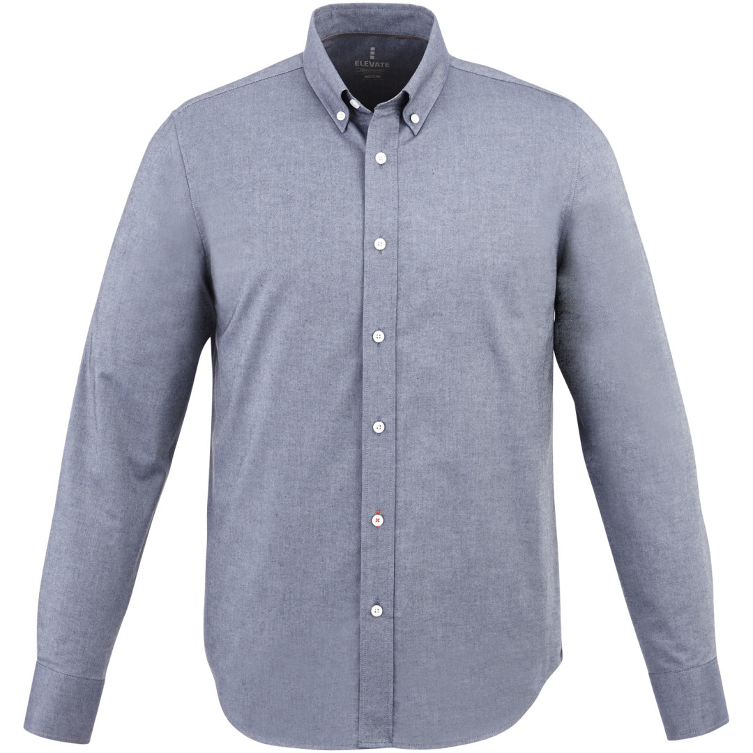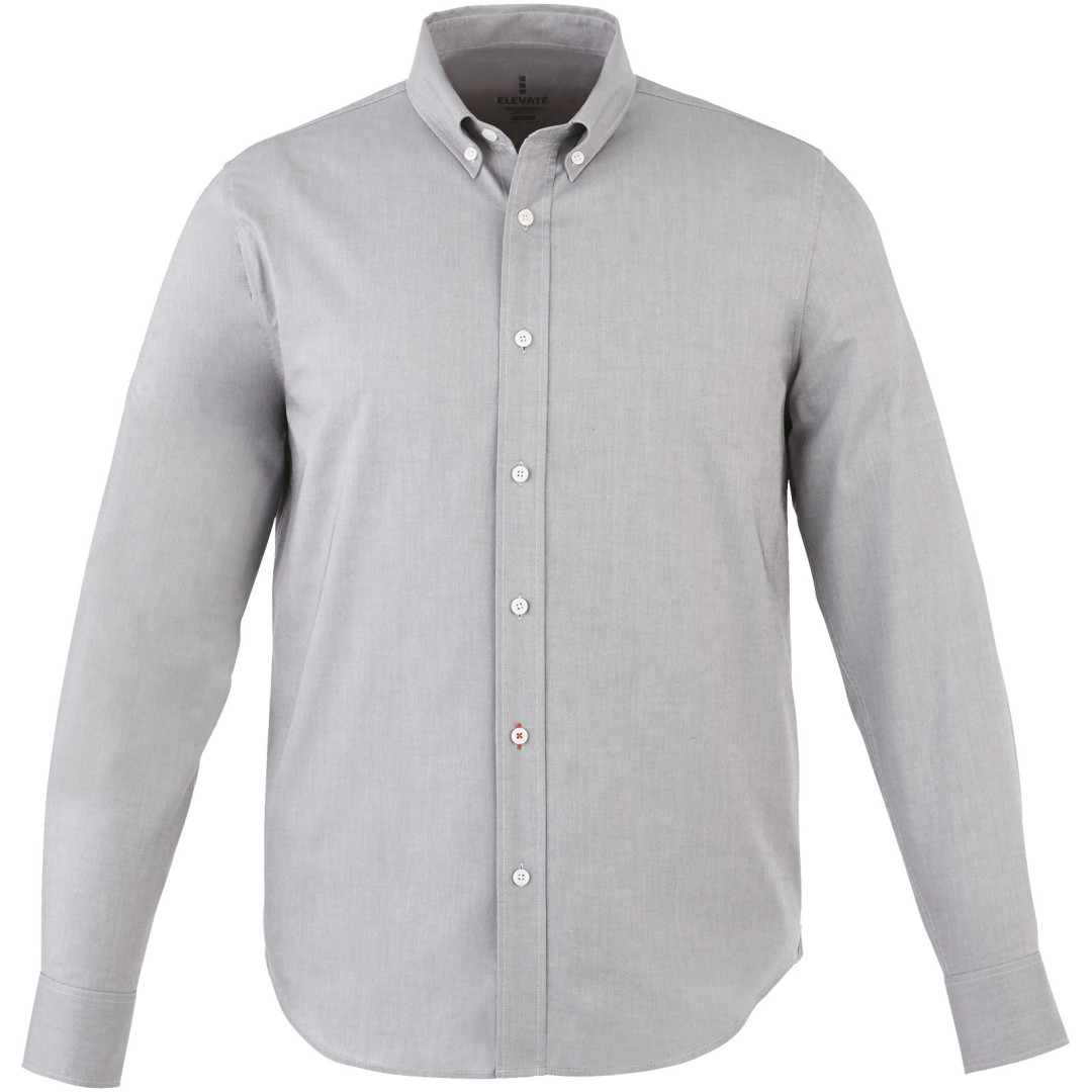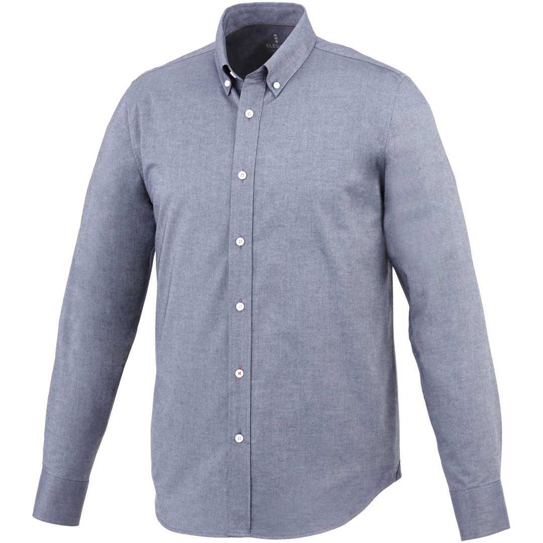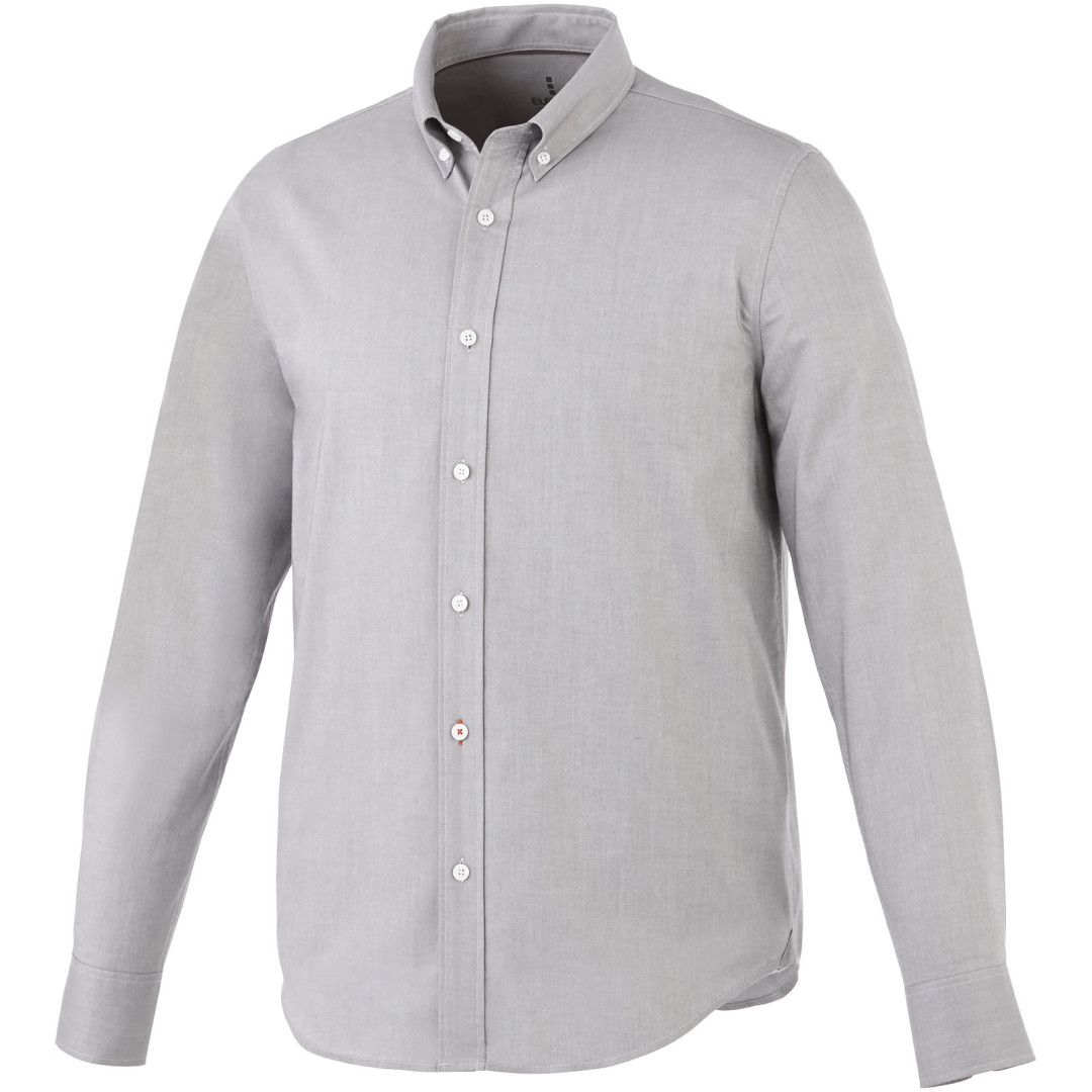 Košeľa Vaillant. Pánsky strih s golierom na gombíky. Biele gombíky s gravírovaním Elevate. Druhá gombíková dierka od spodného lemu s oranžovým stehovaním. Manžetky s dvoma gombíkmi pre nastavenie veľkosti. Rozparok rukáve so zapínaním na gombík. Logo tlačené v farbe na chrbte. Hodvábne lemovanie vnútorného výstrihu. Oxford, 100% bavlna, 40x32 / 2, 110x50. 140 g / m².