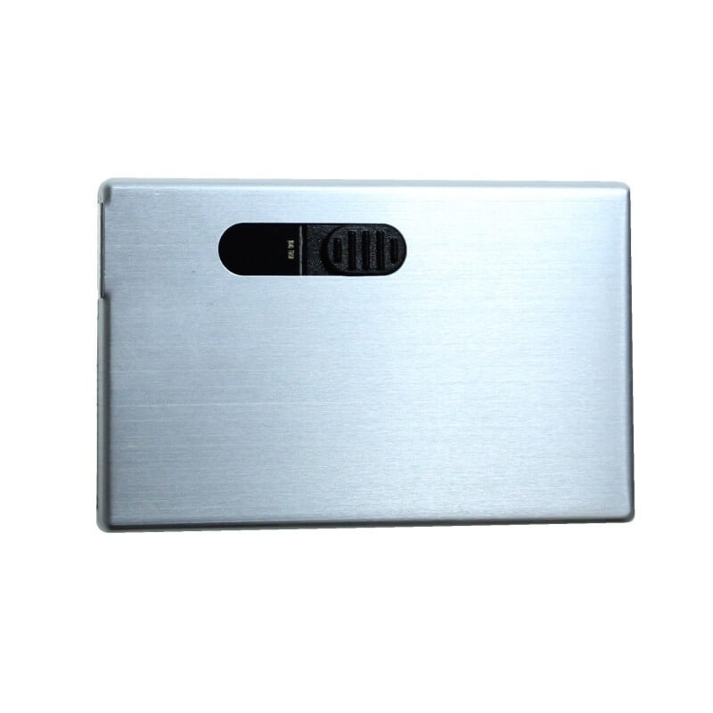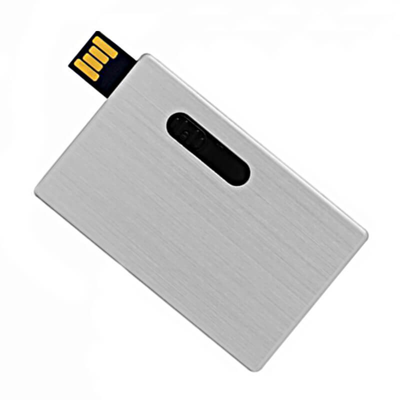 Tenká kovová USB karta s výsuvným konektorom. Vďaka formátu kreditnej karty disponuje veľkou plochou na potlač, takže môže oznámiť veľké množstvo informácií ako na povrchu, tak vo vnútri. Ideálne na prezentácie, veľtrhy, konferencie, apod. Okrem klasického gravíru laserom a tampón tlače na ňu tlačíme aj plnofarebne (CMYK)