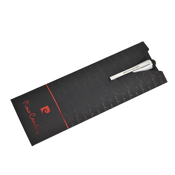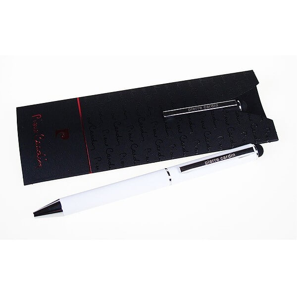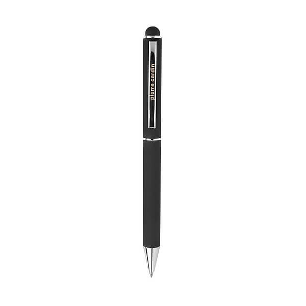 Luxusné guľôčkové pero Pierre Cardin s hliníkovým telom a gumovou povrchovou úpravou, ktorá je veľmi príjemná na dotyk. Pero má strieborné detaily, obsahuje stylus a kvalitné modrú náplň s hrotom 1 mm. Balené v luxusnom vrecku Pierre Cardin, dodávané s certifikátom pravosti. Rozmery: guľôčkové pero 1 × 14 cm, balenie 5,5 × 15,5 cm.