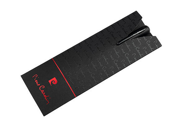 Luxusné guľôčkové pero Pierre Cardin s otočným mechanizmom. Pero má kovové telo v matnom celo-čiernom prevedení s lesklým klipom. Obsahuje kvalitnú modrú náplň s hrotom 1 mm. Balené v luxusnej vrecku Pierre Cardin, dodávané s certifikátom pravosti. Rozmery: guľôčkové pero 1,1 × 13,5 cm, balenie 5,5 × 15,5 cm.