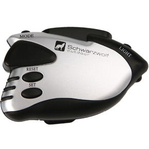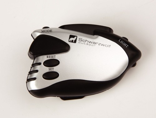Značkový krokoměr Schwarzwolf s červeným LED světlem, plast. Měří počet kroků, vzdálenost, spotřebované kalorie. Baleno v dárkové krabičce.