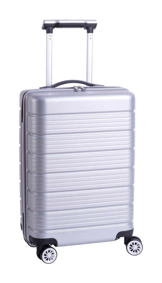 Pevný plastový kufor so 4 otočnými kolieskami, teleskopickou rukoväťou, držiakom na tablet a TSA zámkom. Vr. priehradky na power banku a USB výstupom. Bez power banky.