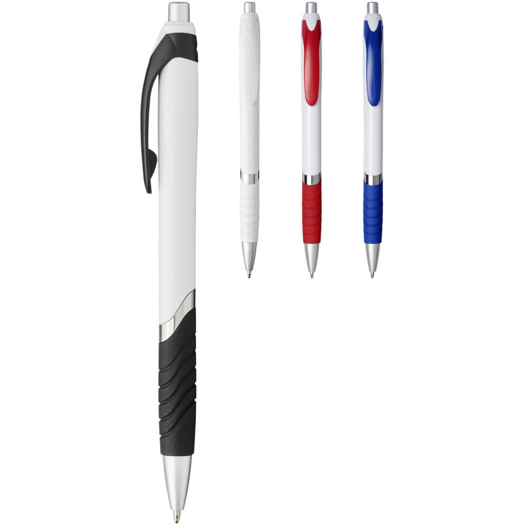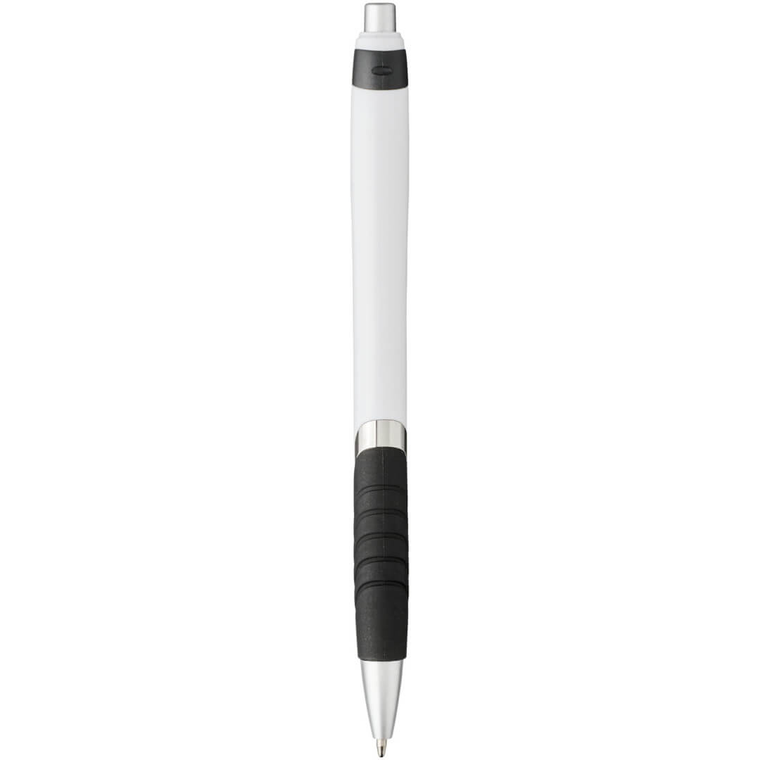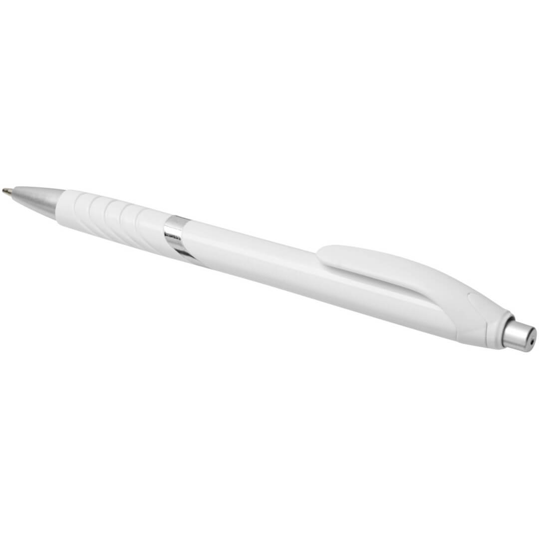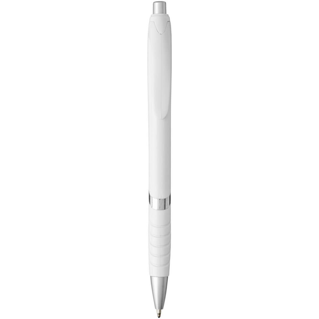 Guľôčkové pero Turbo s telom v bielej farbe. Guľôčkové pero s obľúbeným stláčacím mechanizmom, s telom z bieleho plastu, s farebnou sponou, s gumovým úchopom a strieborným zdobením. ABS plast.