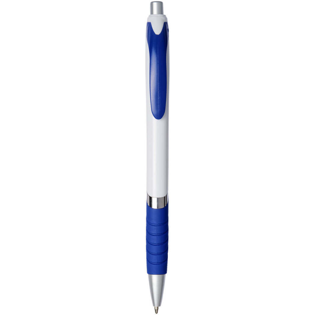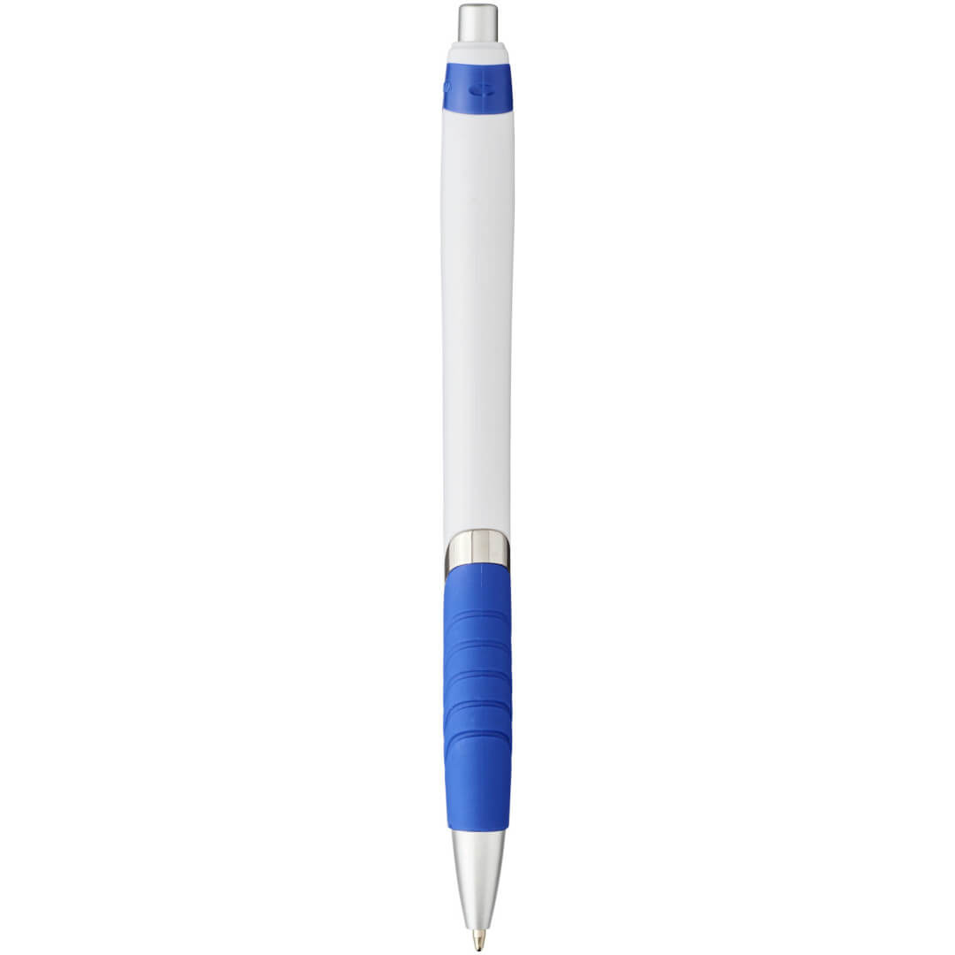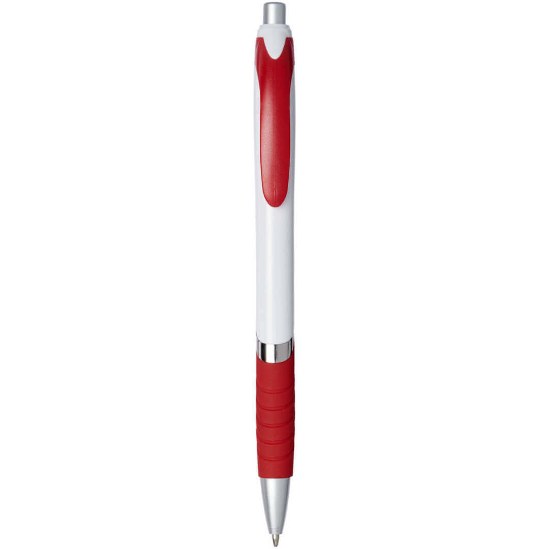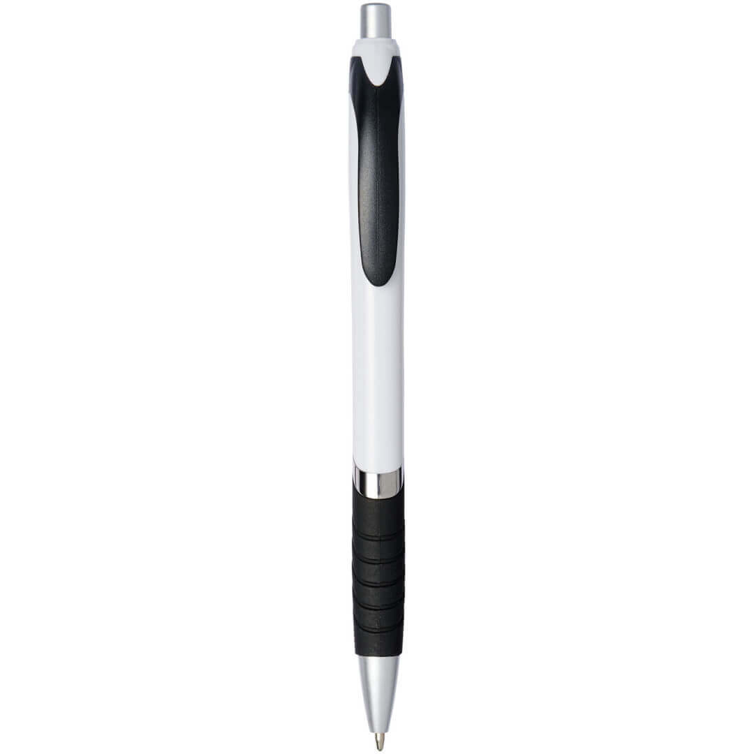 Guľôčkové pero Turbo s telom v bielej farbe. Guľôčkové pero s obľúbeným stláčacím mechanizmom, s telom z bieleho plastu, s farebnou sponou, s gumovým úchopom a strieborným zdobením. ABS plast.