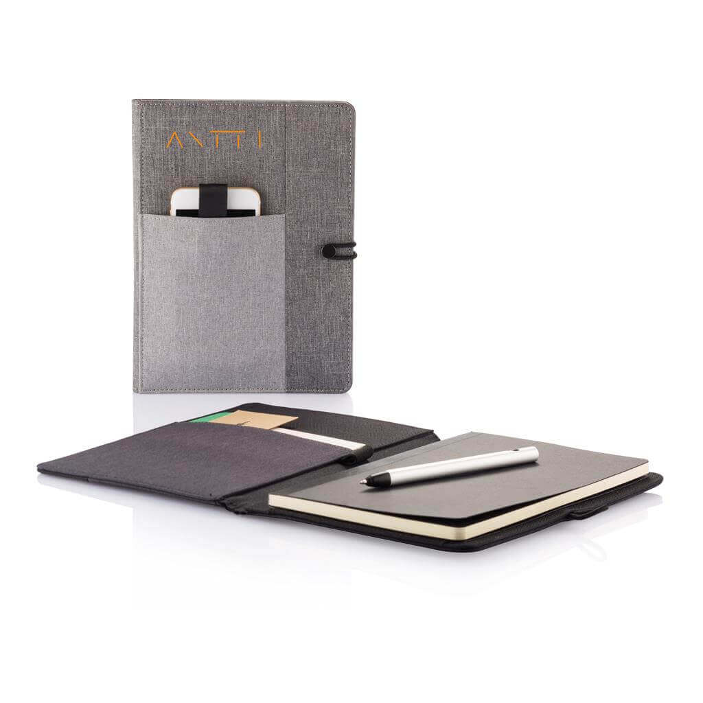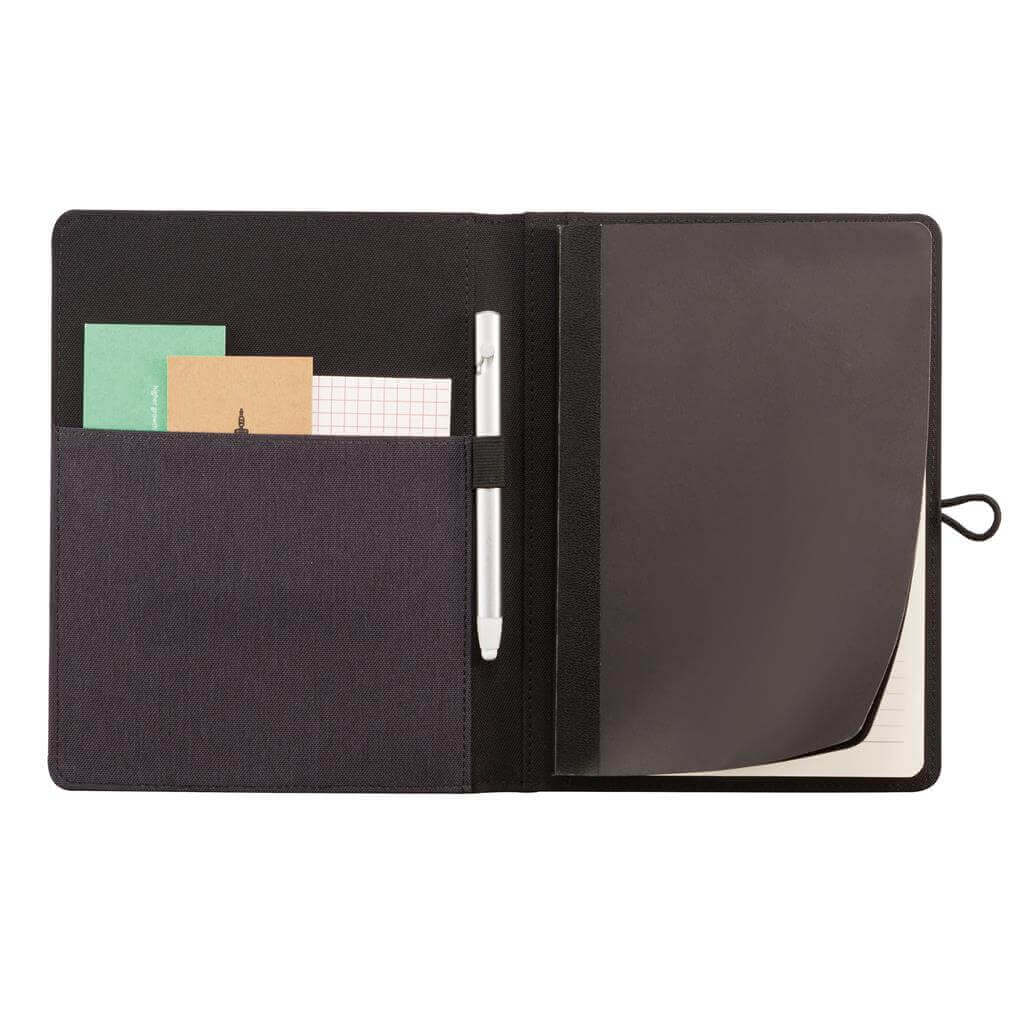 Obal Kyoto na A5 poznámkový blok sa stane vaším nepostrádateľným spoločníkom v každodennom živote. Nielen, že vďaka textilnému poťahu skvele vyzerá je tiež jednoducho praktický. Obsahuje všetky potrebné úschovné priestory (na telefón v prednej časti, perá, poznámky alebo príslušenstvo) a samozrejme poznámkový blok, ktorý možno po dopísaní ľahko vymeniť. Blok má 128 krémových linkovaných strán o gramáži 70g / m2. ochranný vzor®.
