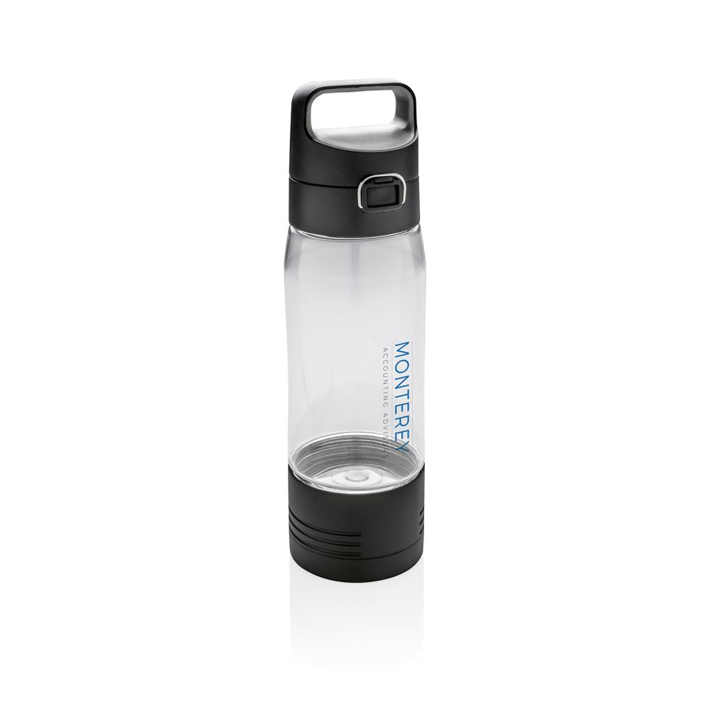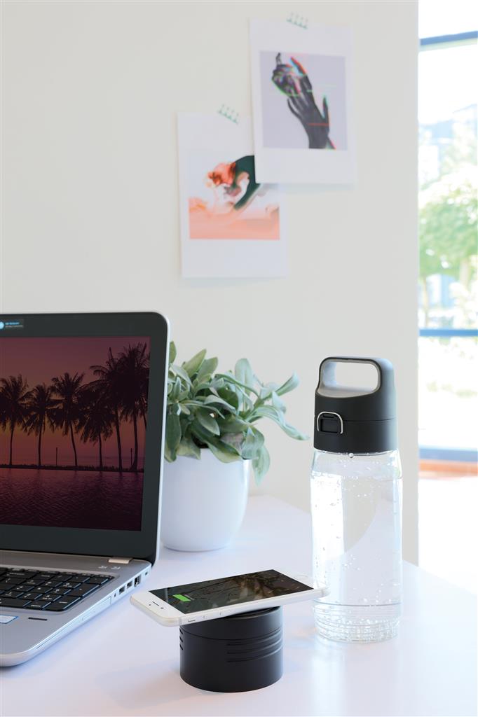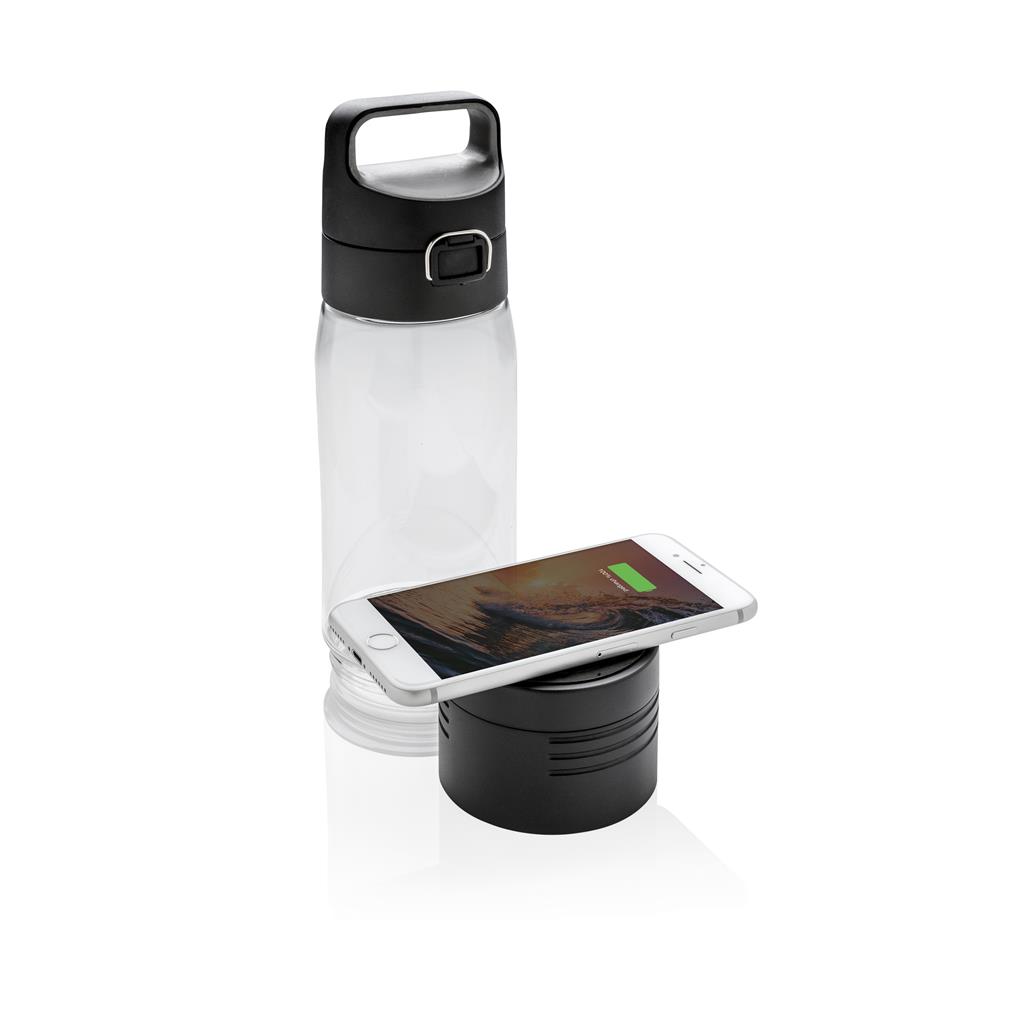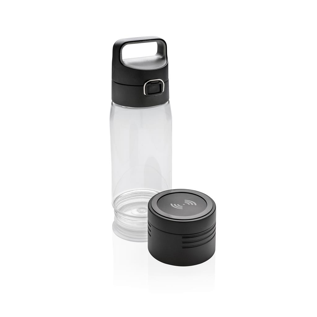 Nepriepustná tritanová fľaša s uzamykateľným uzáverom s rukoväťou. V podstavci sa nachádza 5 000 mAh bezdrôtovo nabíjajúca powerbanka. Kompatibilná so všetkými zariadeniami podporujúce QI, ako sú najnovšie generácie Android, iPhone 8, 8S a X. Vstup 5.0V / 1.0A. Výstup 5.0V / 2.1A. Bezdrôtový výstup: 5W. Objem 600 ml. Ochranný vzor® 2 batérie typu Li-poly súčasťou balenia.
