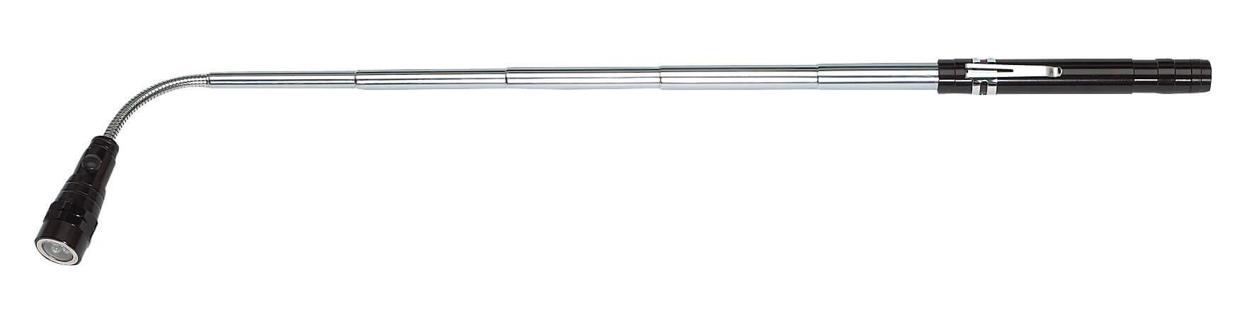 LED baterka REFLECT: teleskopický krk až do cca 55 cm, rotujúce svetlá, 3 biele LED diódy, magnetický krúžok, praktický klip, pogumované tlačidlo pre zapnutie / vypnutie, hliníkové puzdro, batérie 4 x LR44 sú súčasťou balenia