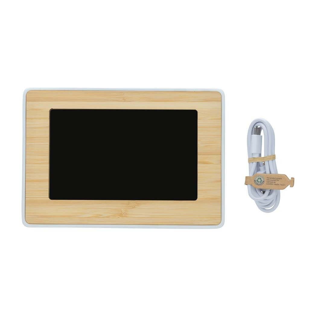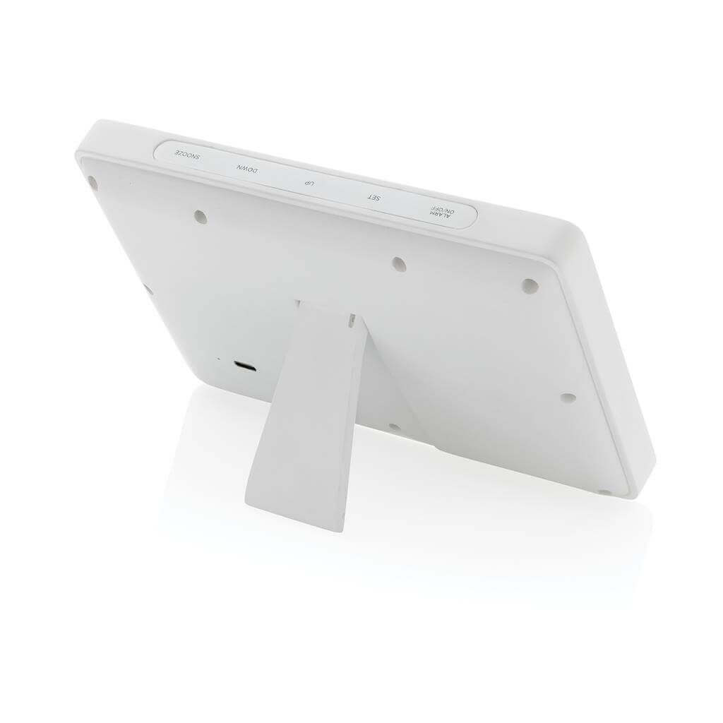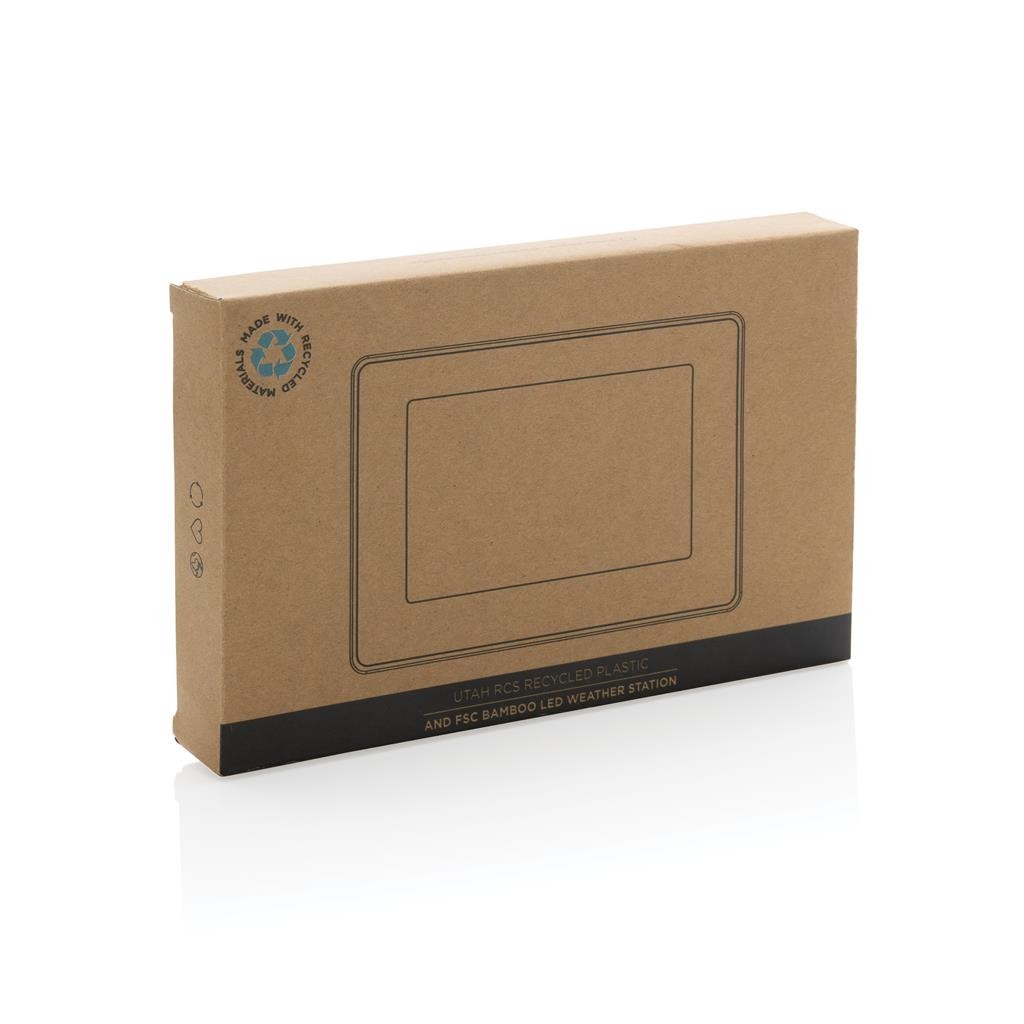 Veľká meteostanica s vysoko kvalitným LED displejom a množstvom funkcií. Funkcia: hodiny (12/24), budík, kalendár, teplota, stupne Celzia/Fahrenheit, vlhkosť, zaznamenávanie vlhkosti, fáza mesiaca. Vyrobené z RCS recyklovaného ABS plastu a FSC® bambusu. RCS (Recycled Claim Standard) je globálny štandard, ktorý umožňuje overiť použitie recyklovaného materiálu v produkte naprieč celým dodávateľským reťazcom. Celkový podiel recyklátu podľa váhy produktu: 65 %. Vrátane 100 cm USB C nabíjacieho kábla z RCS recyklovaného TPE. Balené v FSC® darčekovej krabičke. 1 batéria typu Button cell súčasťou balenia.