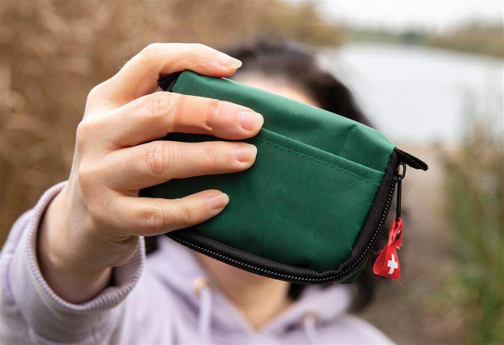 Taštička s jednou prednou kapsou, jedným čiernym hlavným oddielom na zips a očkom na opasok na zadnej strane taštičky. Obsah: trojrohá šatka, PBT ovínadlo, dezinfekčný tampon, náplasti, nožnice, zatvárací špendlík a leukoplast. Vyhovuje norme EN 13485:2003.