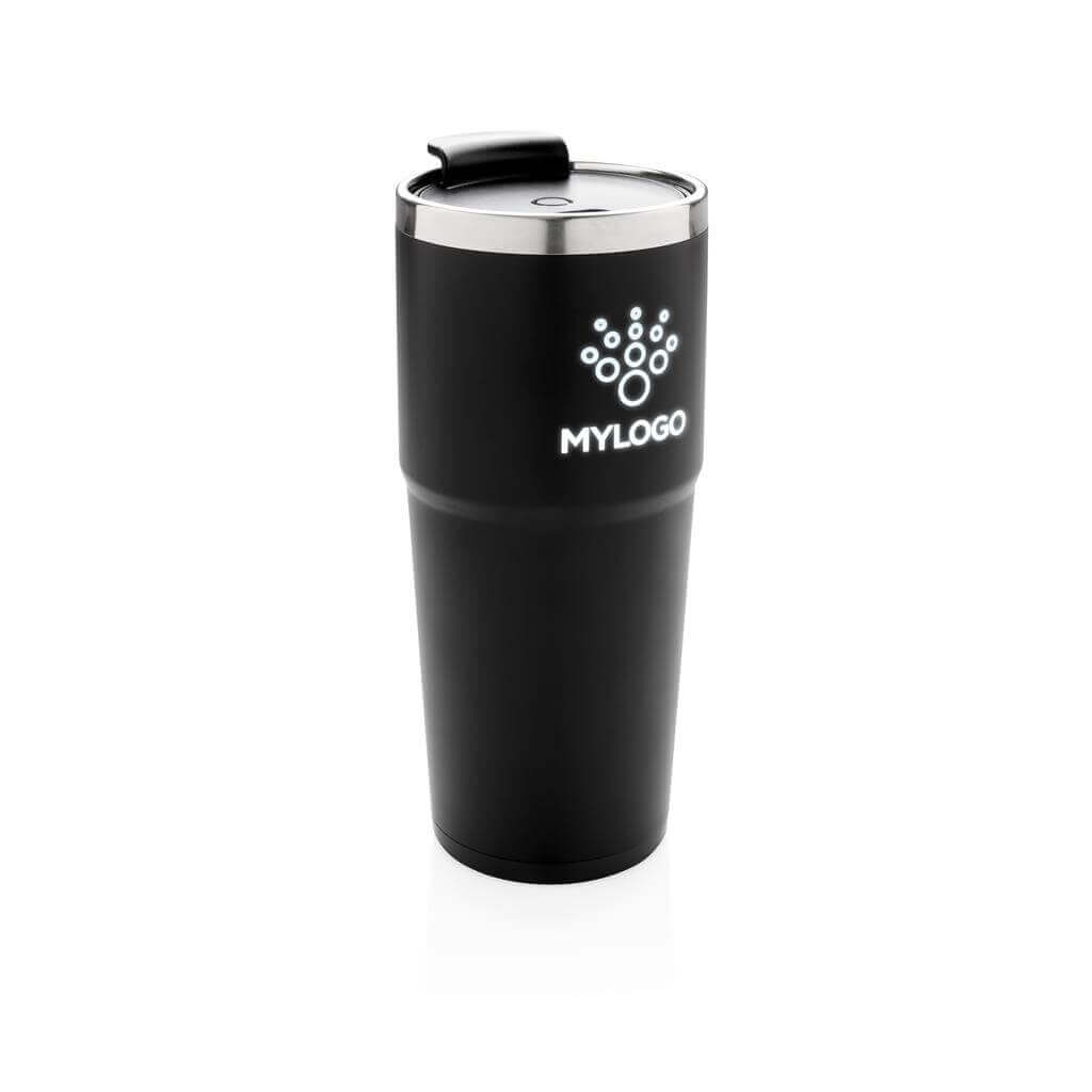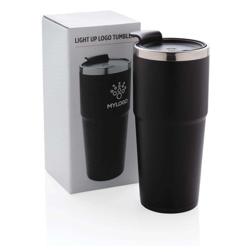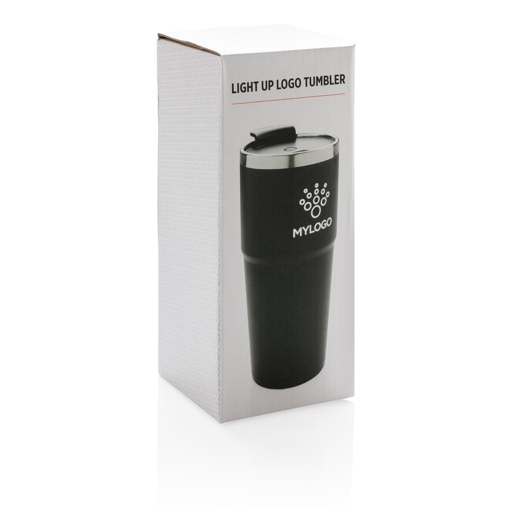 Termohrnček s dvojitou stenou, vyrobený z nerezovej ocele (vnútri 304 SS, vonkajšie ABS plast). Gravírované logo sa po zatrasení osvetlí. Obsahuje 2 CR2032 batérie. Objem 480 ml. 2 baterie typu button cell súčasťou balenia.