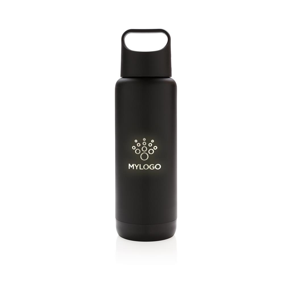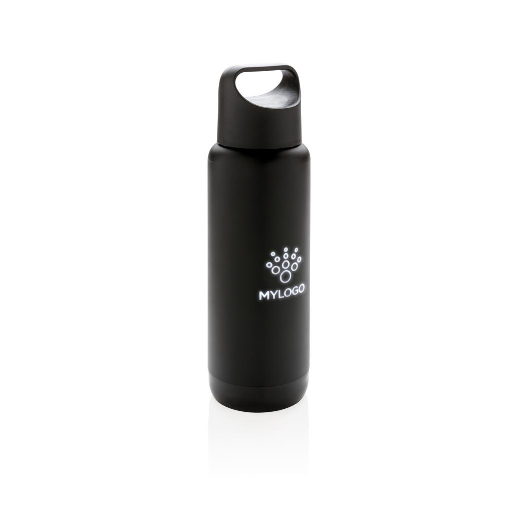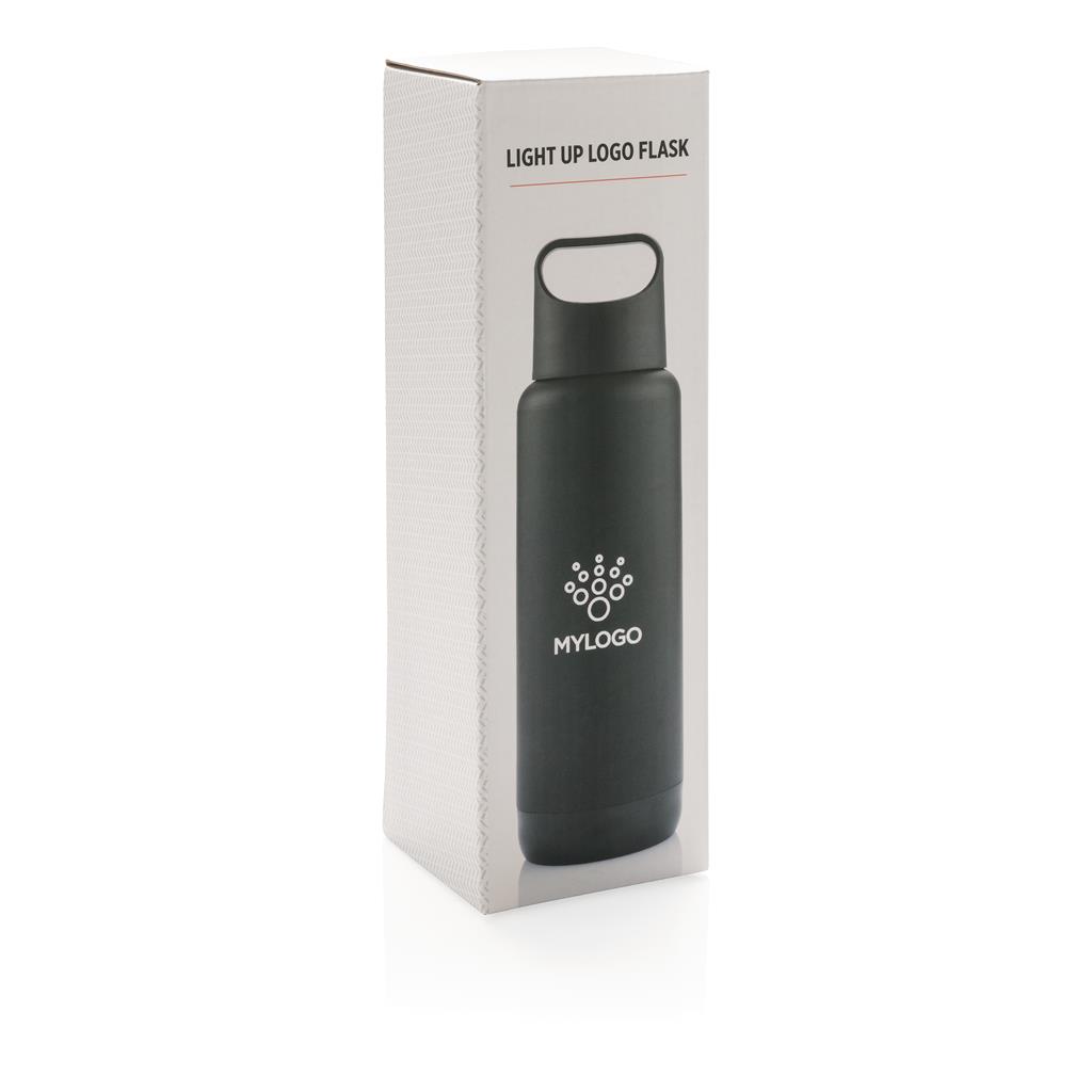 Termo fľaša s dvojitou stenou, vyrobená z nerezovej ocele ( vnútri 304 SS, vonku ABS plast). Gravírované logo možno podsvietiť. Obsahuje 2 CR2032 batérie. Objem 500 ml. 2 batérie typu button cell súčasťou balenia.
