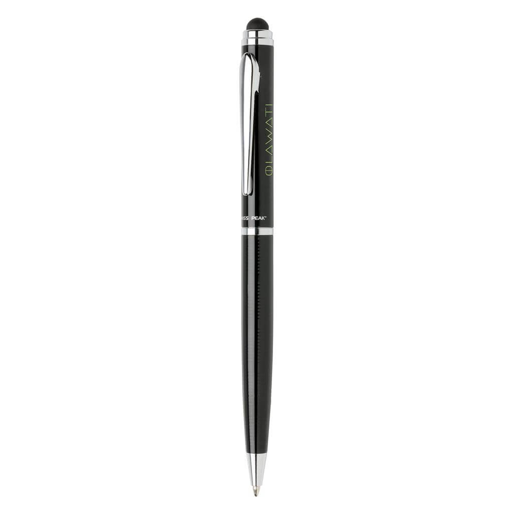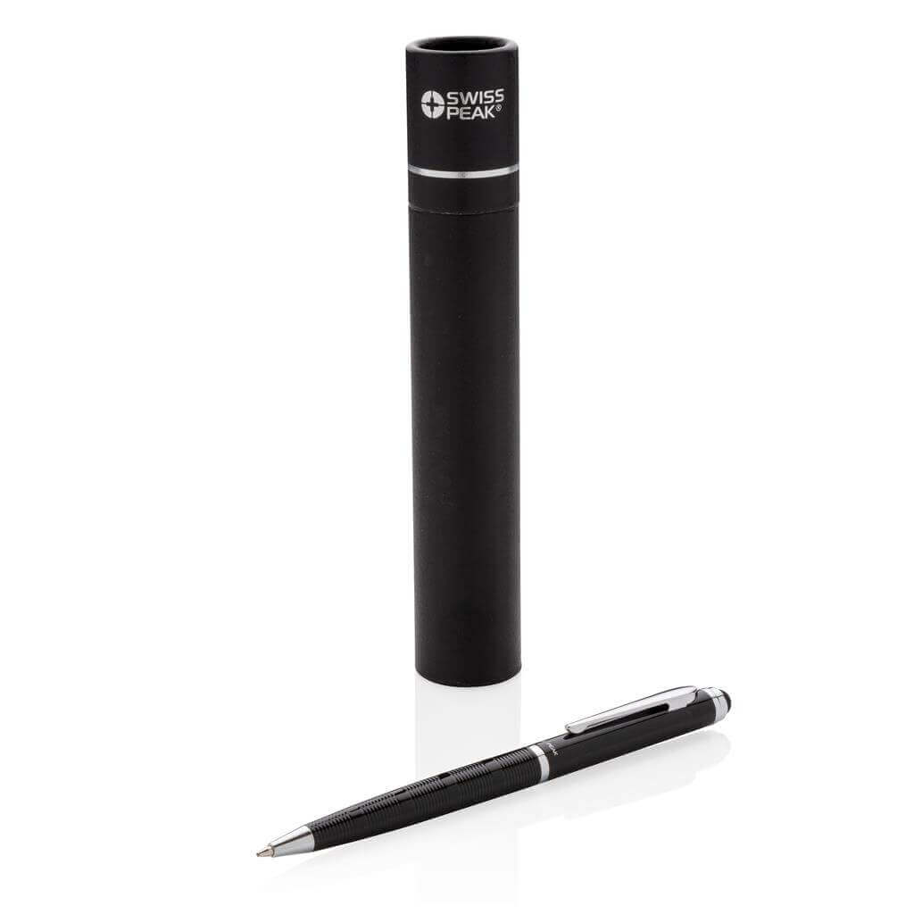 Luxusné stylusové pero s pruhovým vzorom. Veľmi kvalitné guličkové pero s modrým atramentom je dodávané v darčekovej krabičke Swiss Peak, je teda ideálnym darčekom!