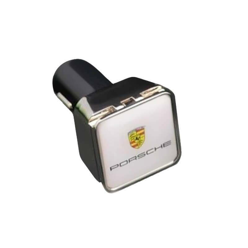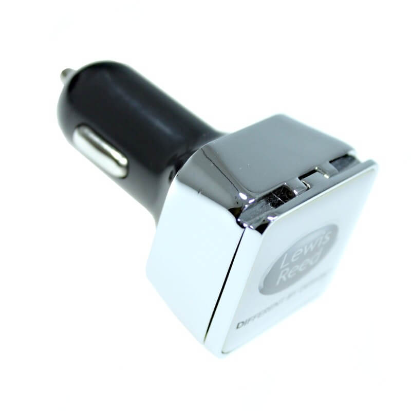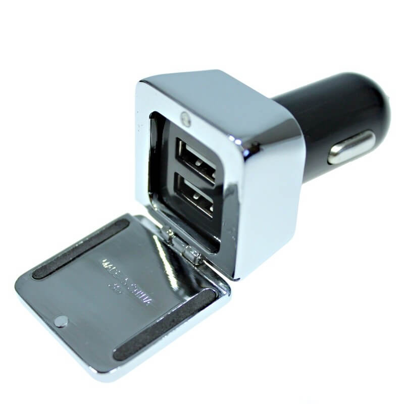 USB duálna auto nabíjačka (USB adaptér do autozapalovača). Luxusné prevedenie, masívne kovové telo s otváracím krytom. Možnosť plnofarebného loga (logoprint). Nabíja iPod a iPhone, Smartphone, iPad, iPad2 alebo tablet a pod. Má 2 USB výstupy 2,1 A + 1A, pre nabíjanie dvoch zariadení súčasne.