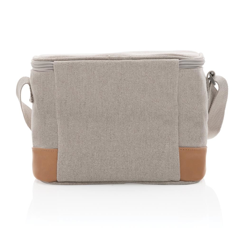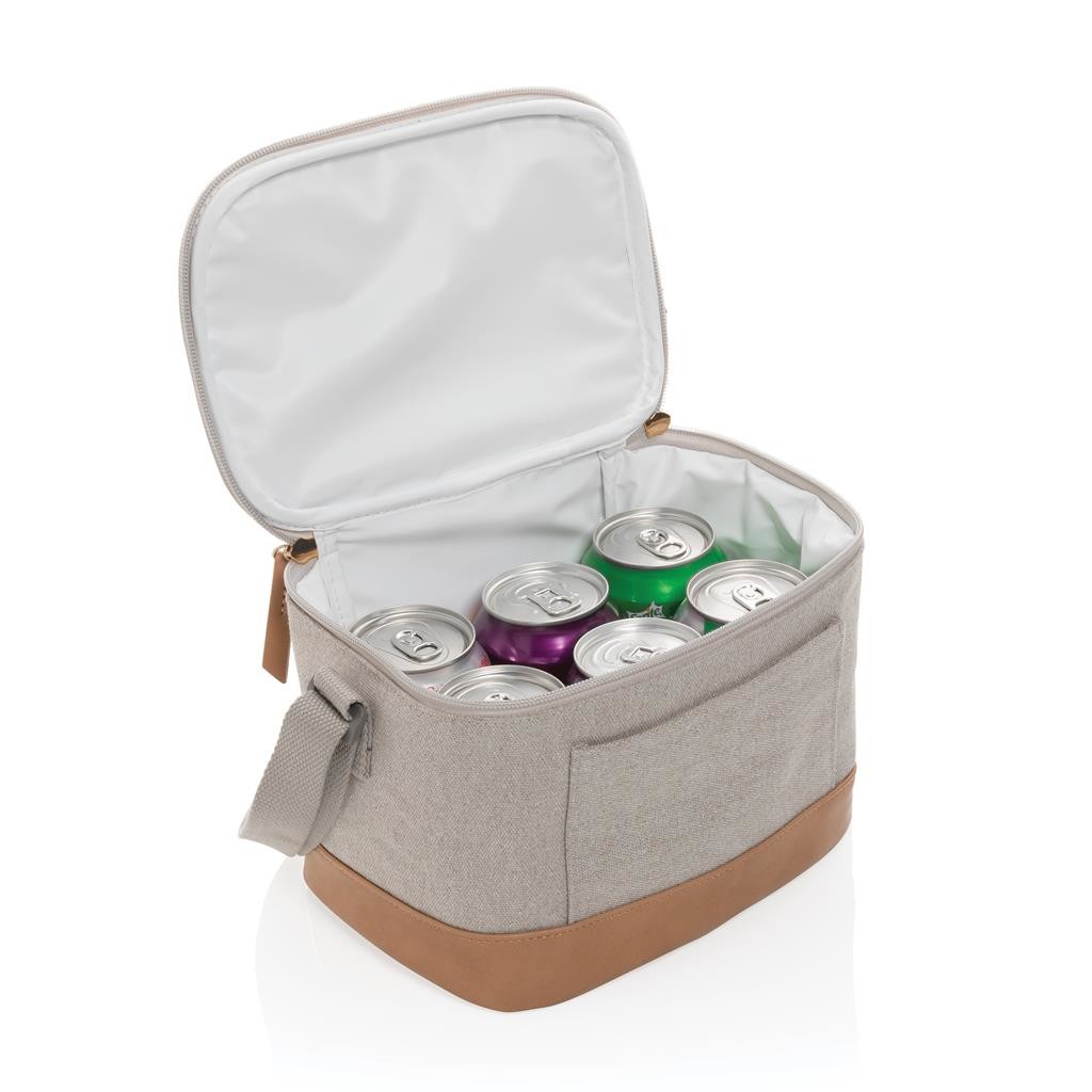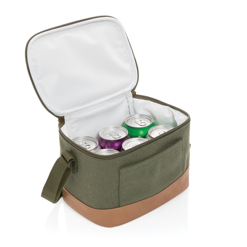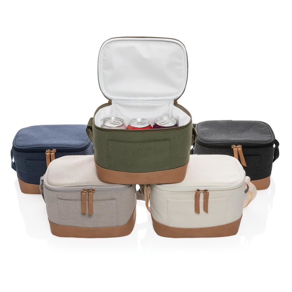 Kompaktná chladiaca taška vyrobená z 16 oz. recyklovaného canvas s elegantnými detailmi z PU kože. Hlavný chladiaci priestor pre až 6 plechoviek, predné otvorené vrecko, uši pre ľahké nosenie. Vrátane skenovateľnej zložky AWARE™ garantujúce obsah recyklátu. V porovnaní s konvenčným canvasom bolo výrobou každého kusu usporených 506,2 litrov vody. Z výťažku každého predaného produktu z kolekcie Impact je navyše prispených 2 % na podporu iniciatívy Water.org. Rozloženie materiálu: 60% recyklovaná bavlna, 40% recyklovaný polyester, podšívka z PEVA.