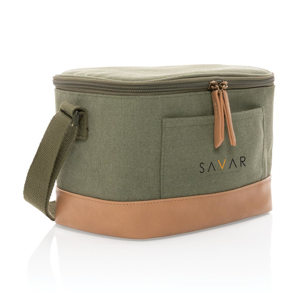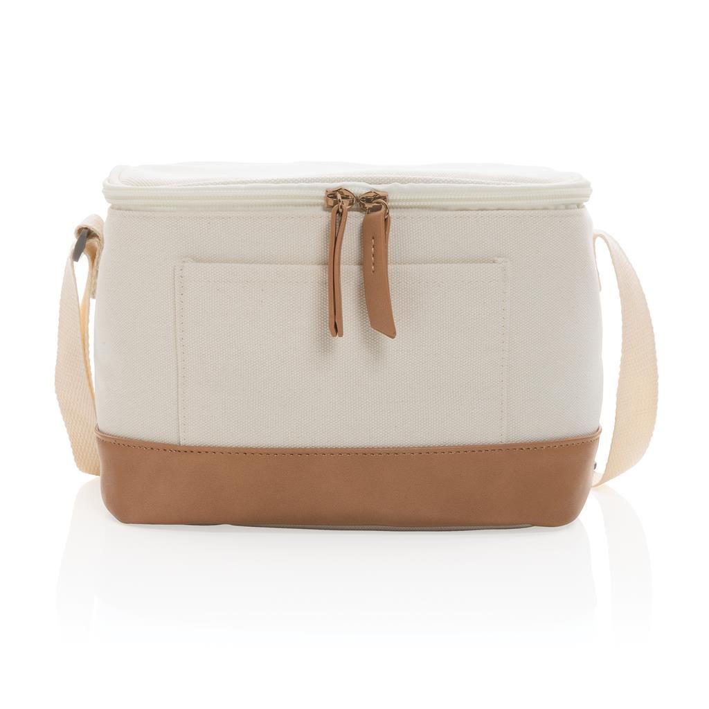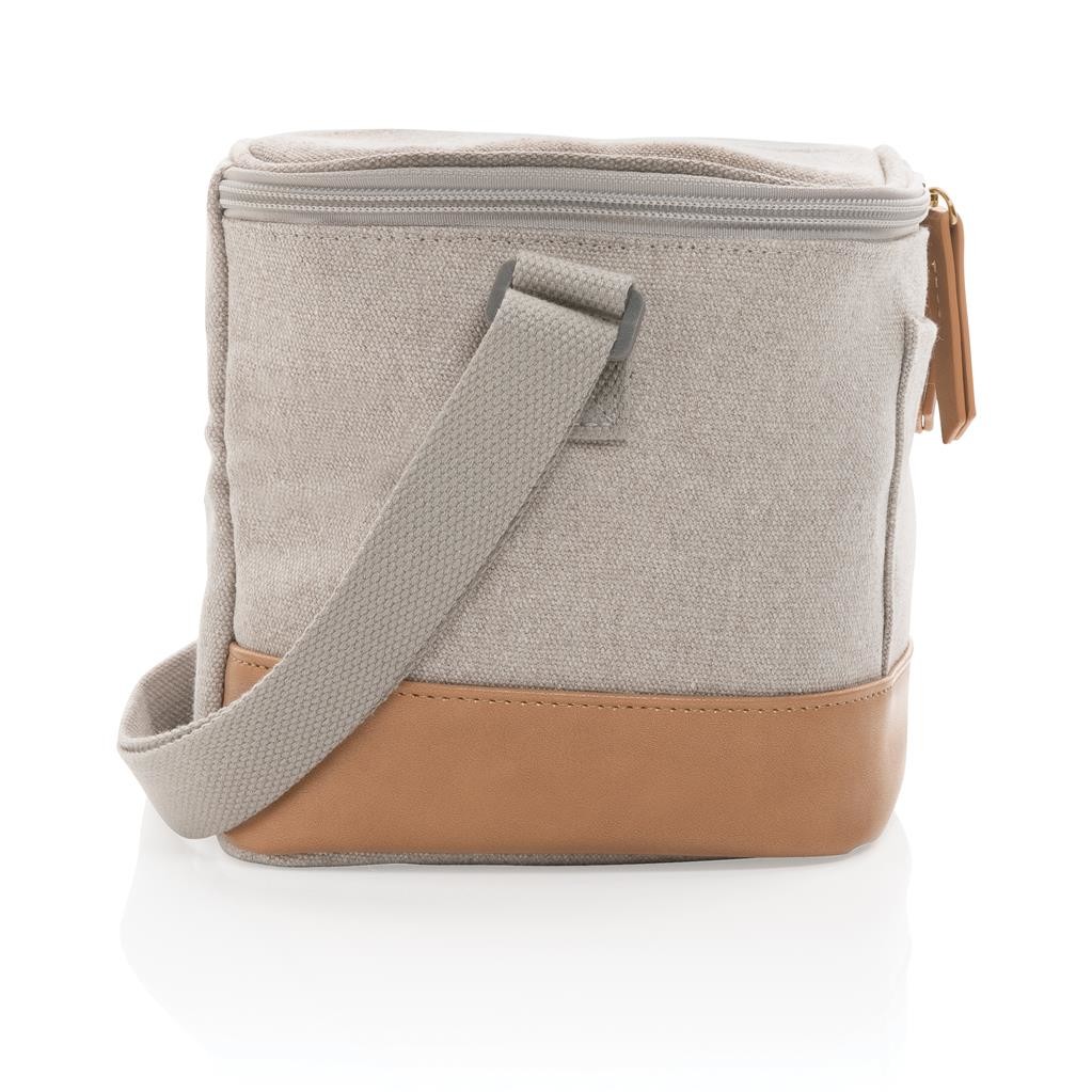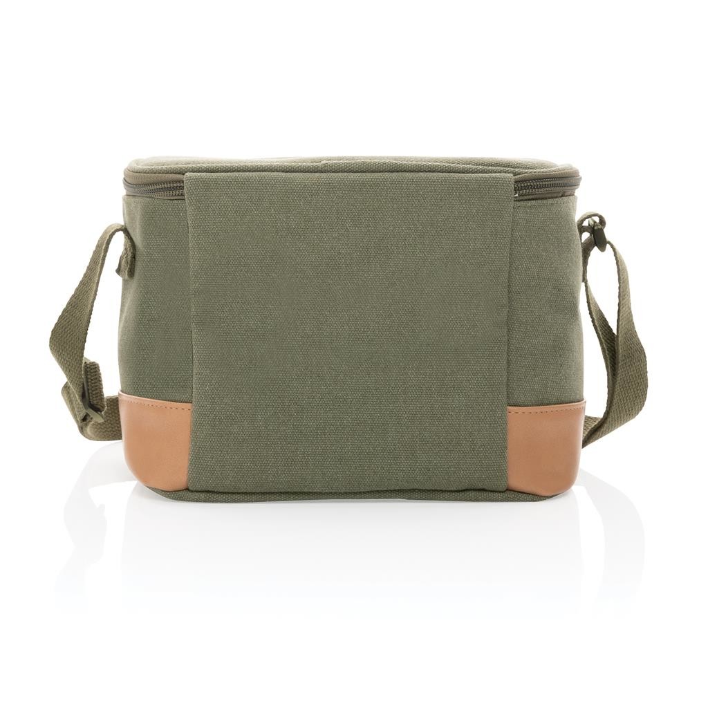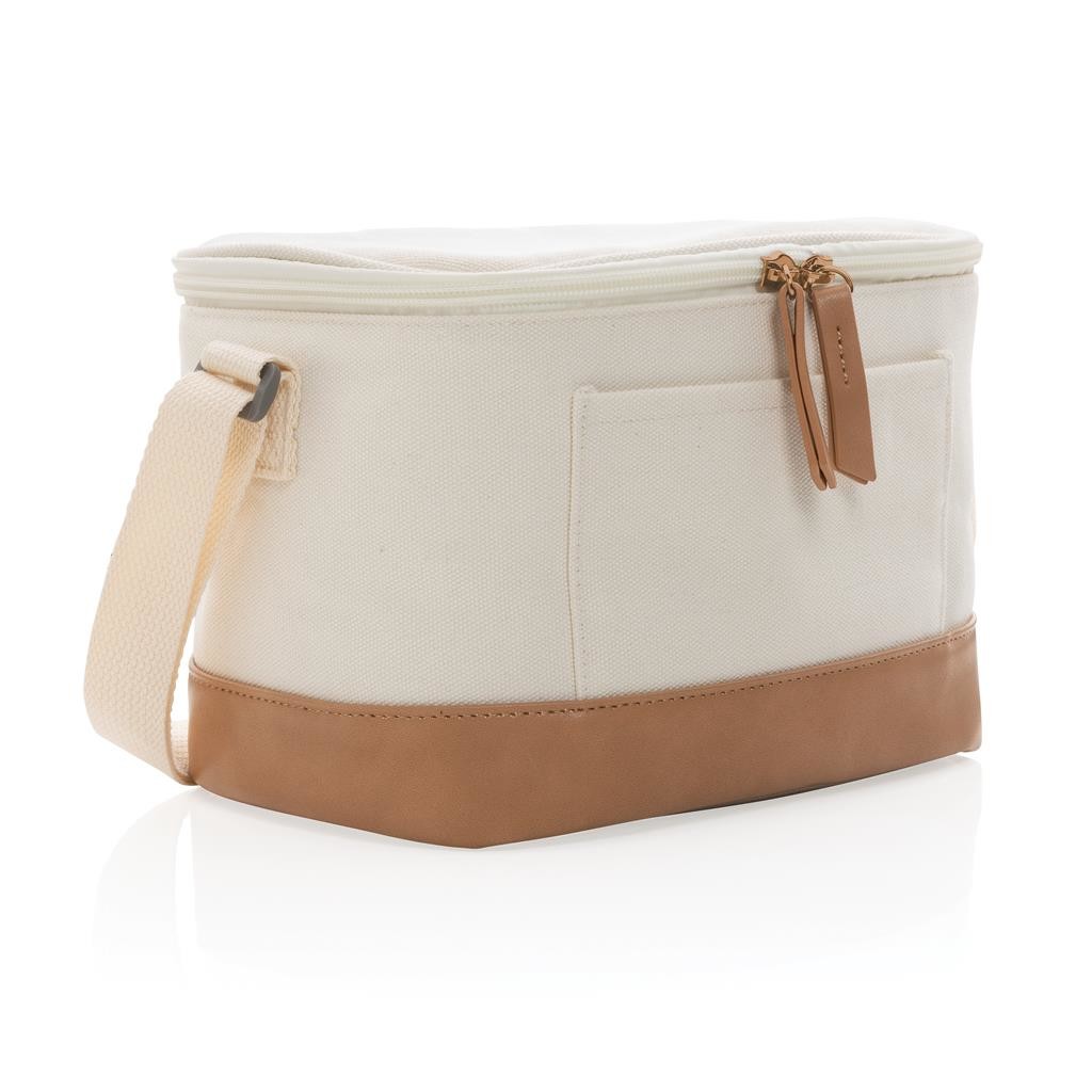Kompaktná chladiaca taška vyrobená z 16 oz. recyklovaného canvas s elegantnými detailmi z PU kože. Hlavný chladiaci priestor pre až 6 plechoviek, predné otvorené vrecko, uši pre ľahké nosenie. Vrátane skenovateľnej zložky AWARE™ garantujúce obsah recyklátu. V porovnaní s konvenčným canvasom bolo výrobou každého kusu usporených 506,2 litrov vody. Z výťažku každého predaného produktu z kolekcie Impact je navyše prispených 2 % na podporu iniciatívy Water.org. Rozloženie materiálu: 60% recyklovaná bavlna, 40% recyklovaný polyester, podšívka z PEVA.