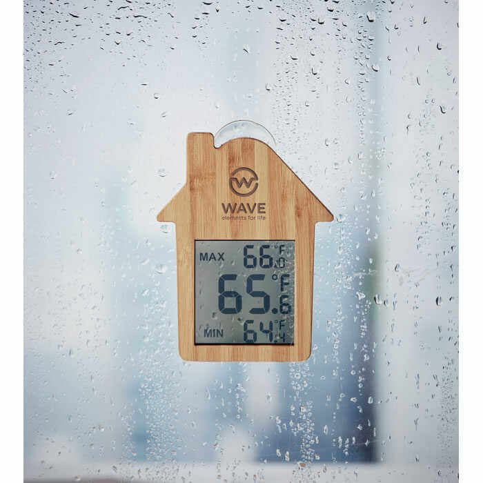 Bambusová meteostanica v tvare domčeka s prísavkou na zadnej strane. S týmto teplomerom budete vždy vedieť, aká je teplota vo vnútri vášho domova. Na LED displeji sa zobrazuje aktuálna, minimálna a maximálna teplota. Na zadnej strane je prísavka na zavesenie malého domčeka na okno, skriňu alebo inam. Súčasťou balenia je 1 batéria LR44. Bambus je prírodný materiál, pri každom jednotlivom kuse sa môžu vyskytnúť drobné odchýlky vo farbe a veľkosti, ktoré môžu mať vplyv na finálnu podobu potlače.