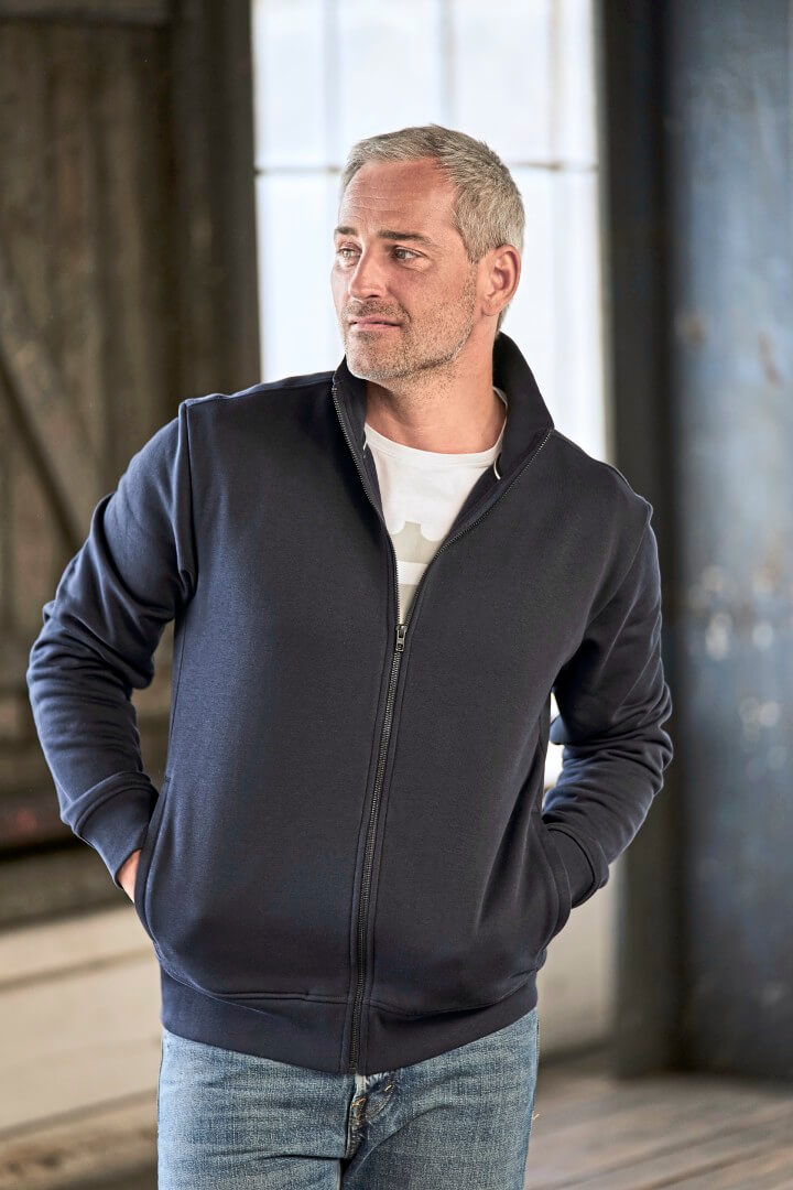 70% česaná bavlna / 30% polyester | Klasický kardigán s dlhým zipsom z česanej teplákoviny s vysokou gramážou | Dvojito prešívané elastické manžety | Žebrovaný zvýšený golier a pás | Dve predné vrecká na zips | Elastan vo všetkých rebrách | 3-vrstvová tkanina | Česaná vnútorná úprava | Dvojité farbenie