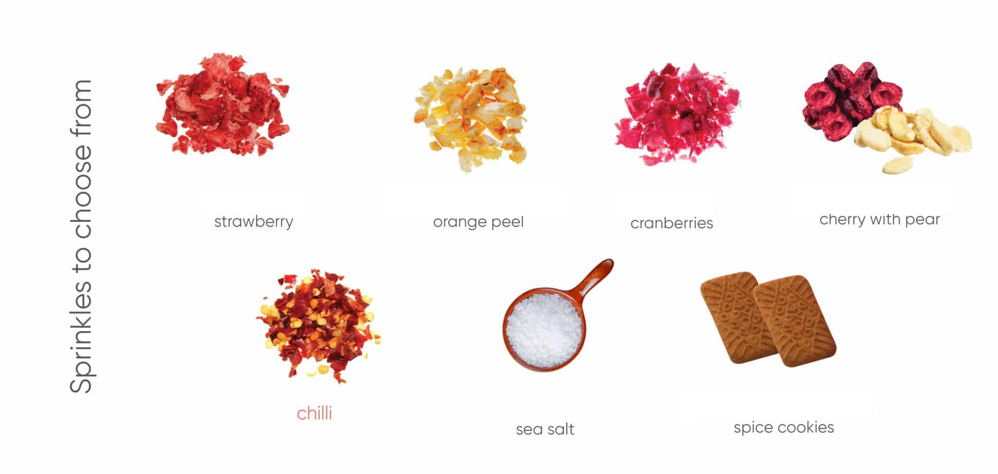 Nádherná belgická čokoláda s osviežujúcim ovocným nádychom vo verzii bez cukru, ktorú sme nahradili maltitolom. Pomocou tohto produktu ako príkladu môžete vidieť, ako funguje sila personalizácie. Ponúkame na výber 1 zo 7 ochutených posýpiek.