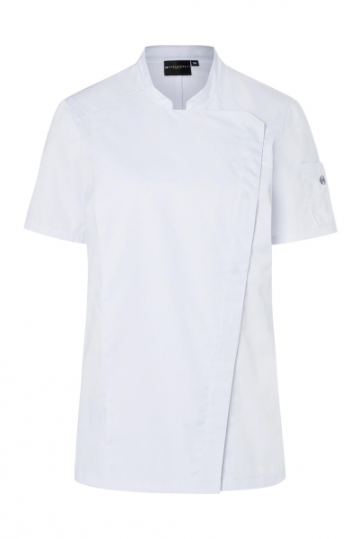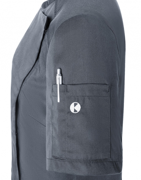 150 g/m², 50% polyester, 50% bavlna (keper), popruh na zadnom golieri na upevnenie podbradníkovej zástery (zabraňuje pošmyknutiu), skrytý panel na patentky vyrobený z veľmi ľahkej tkaniny, krátke rukávy, našité vrecko na rukáve na ľavej strane s priehradkou na pero, perfektne sa hodí pre pohodlnú prácu v teplom prostredí, vysoko rafinovaný, predzarazený, stálofarebný, nenáročný na údržbu, vhodný pre priemyselné práčovne, možné prať do 95°C, štíhlá silueta
